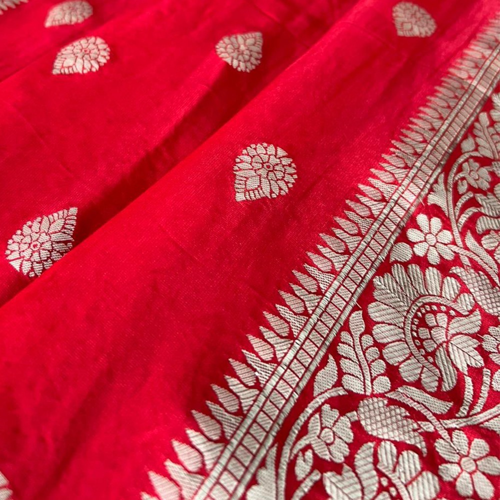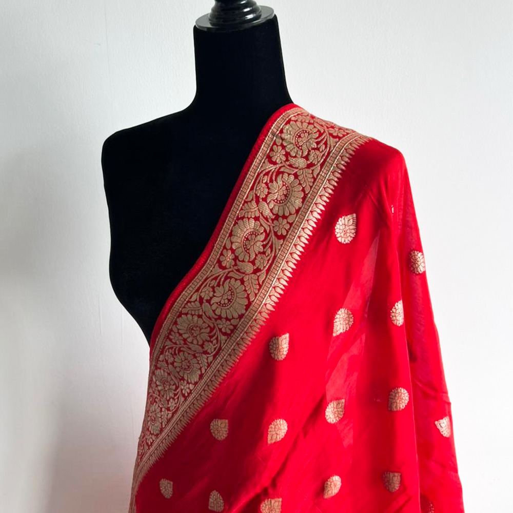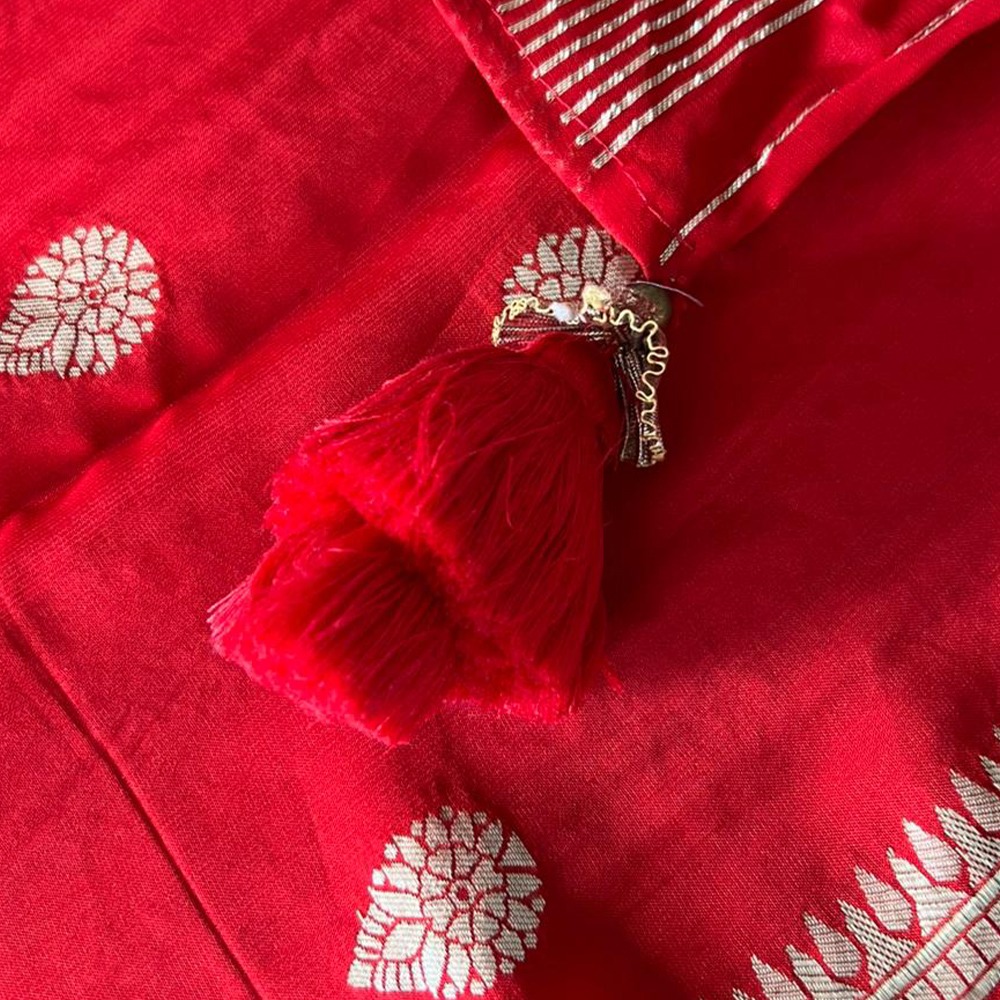 A classic red Banarasi-style dupatta with antique gold threadwork — featuring a bold floral border and buti motifs scattered across the body. Finished with matching red tassels for a festive touch.