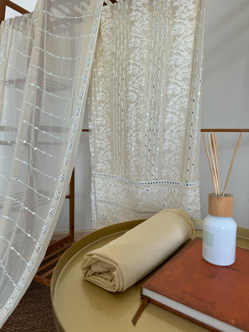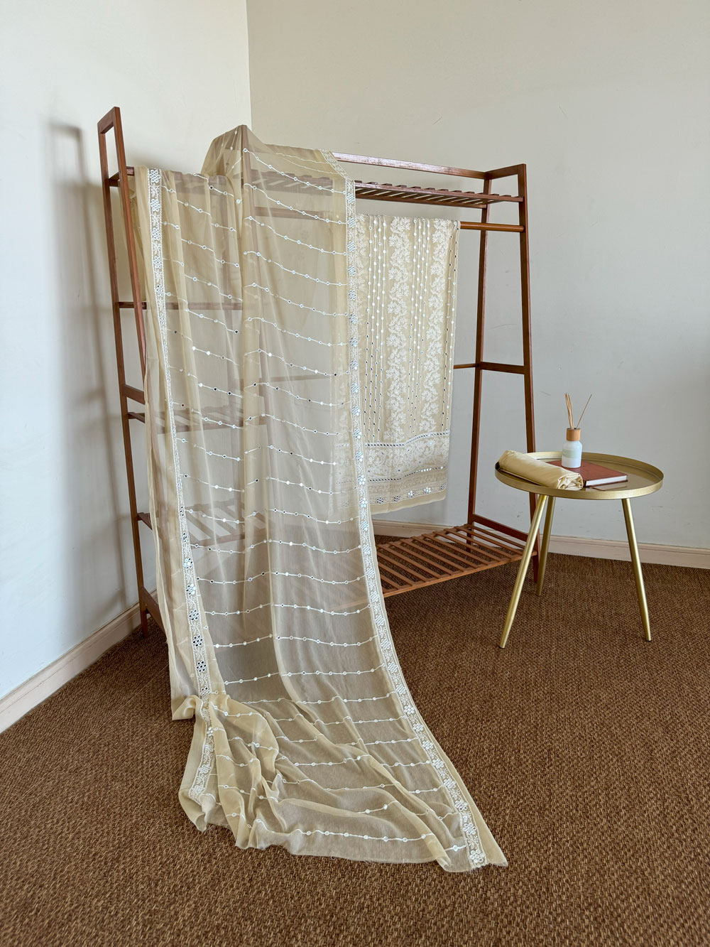 Beige embroidered unstitched material set with sheer dupatta on a wooden rack; pant material placed on the side table.