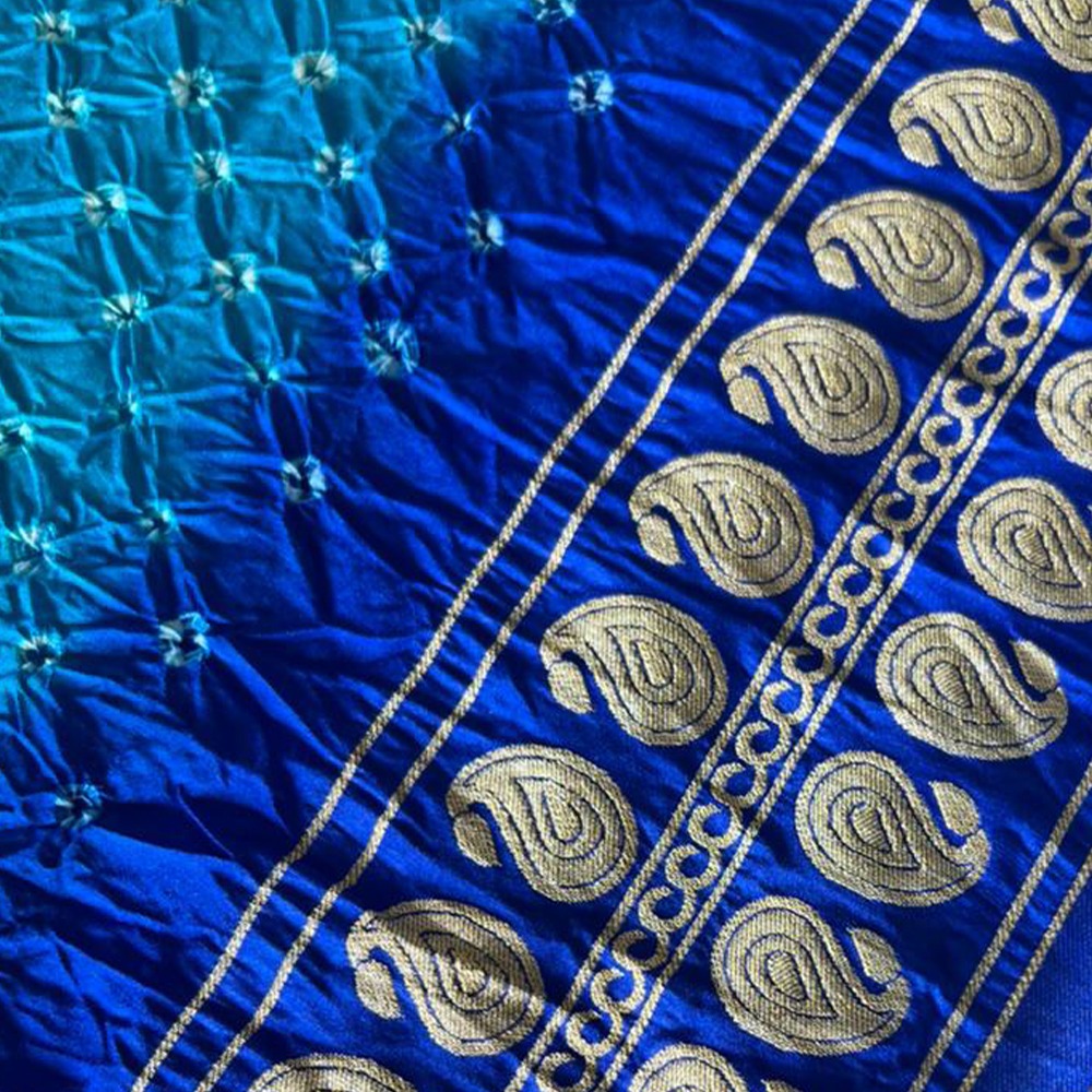 A rich royal blue merges into aqua with delicate bandhani dots and floral-inspired paisley embroidery in gold. The vibrant tones and intricate border work make it a standout piece for any wardrobe.