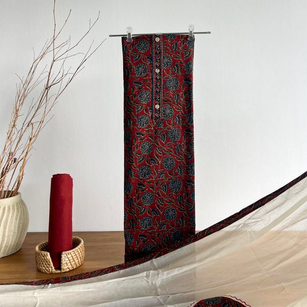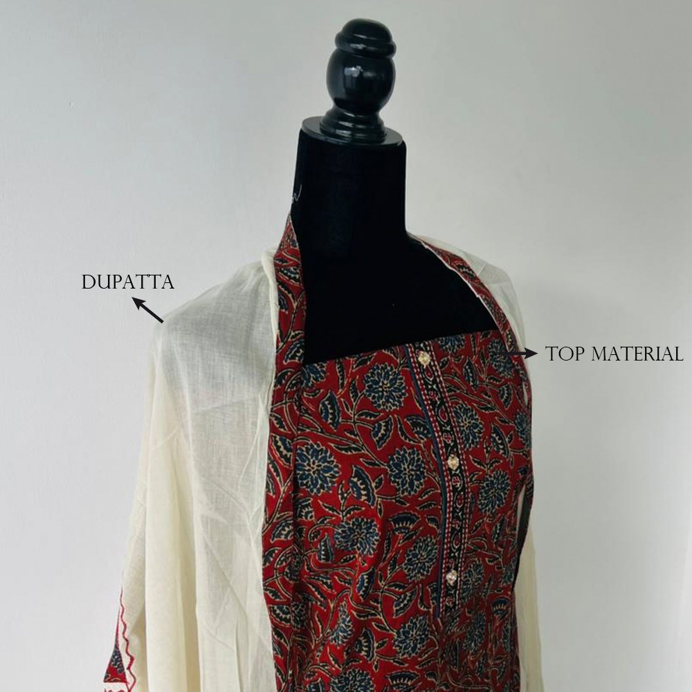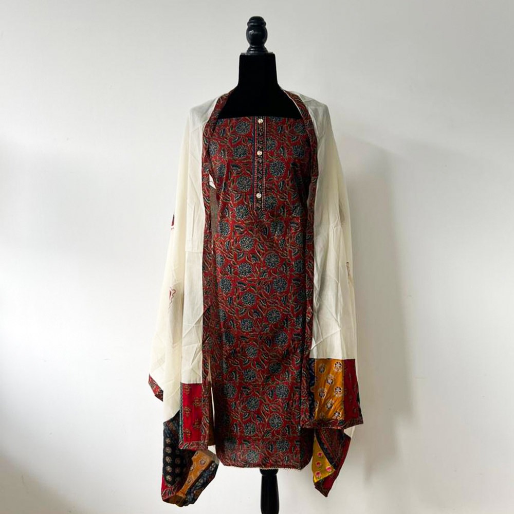 A warm brick-red unstitched set featuring floral prints with a soft off white dupatta and matching plain pant material. Detailed with elegant gold toned buttons along the neckline for a touch of charm. Light, breathable, and perfect for day wear or casual outings.