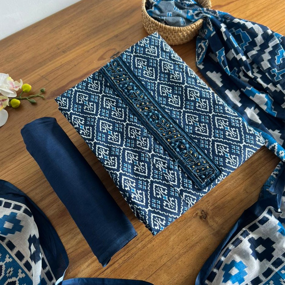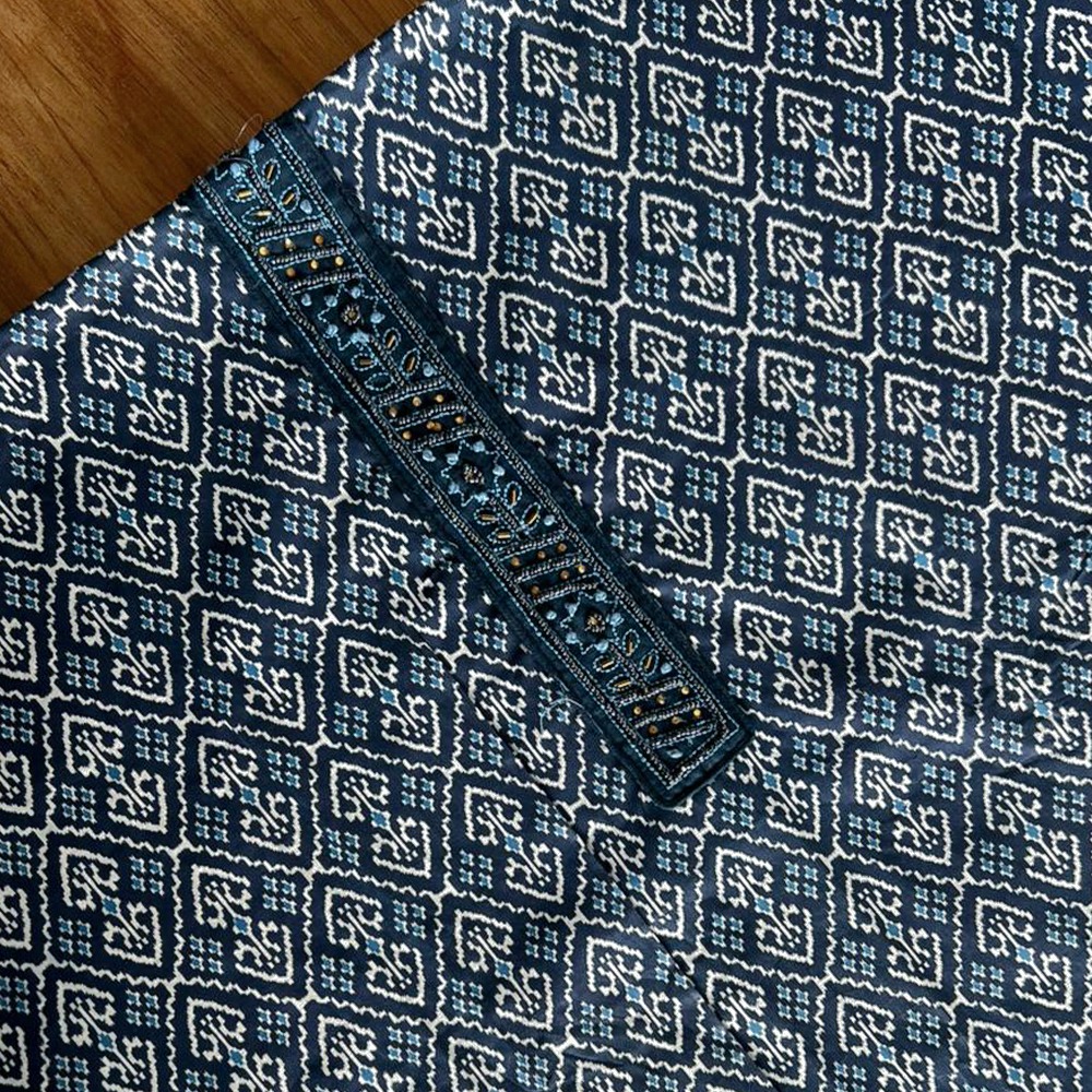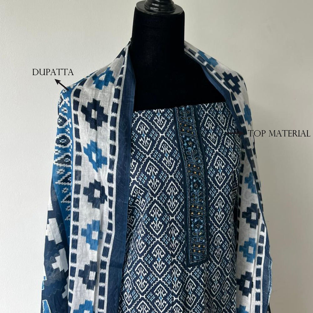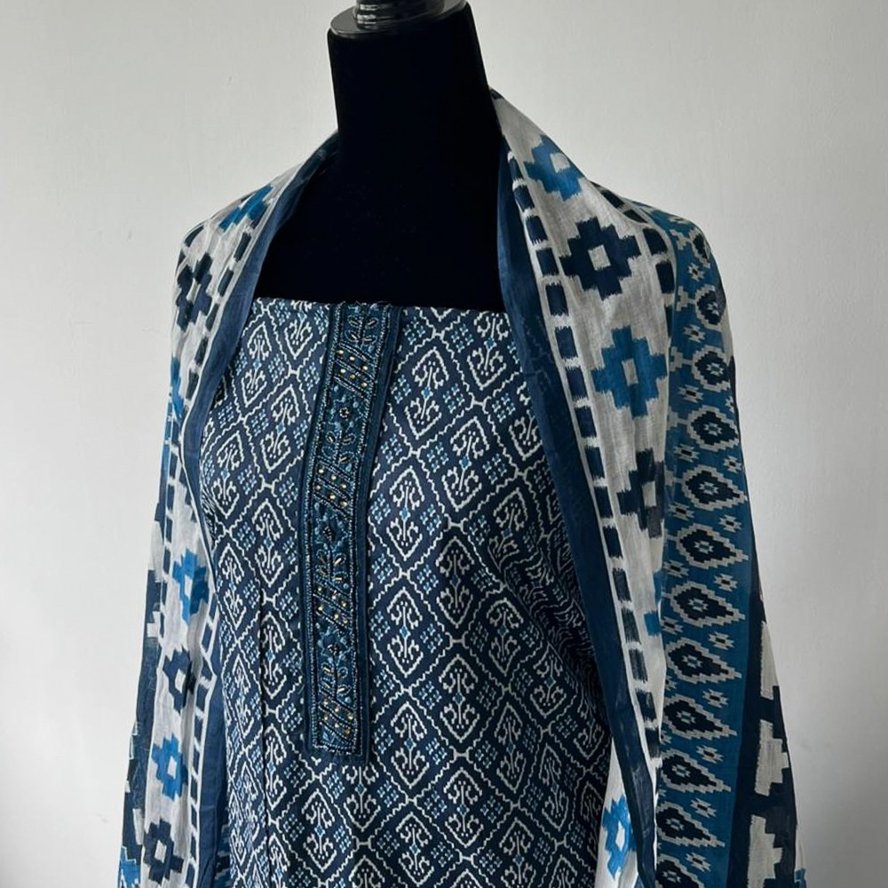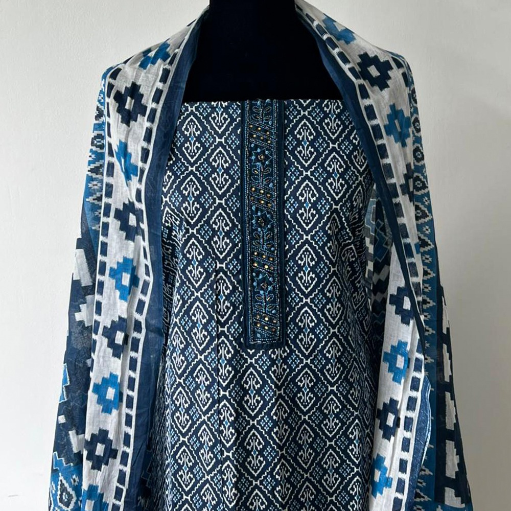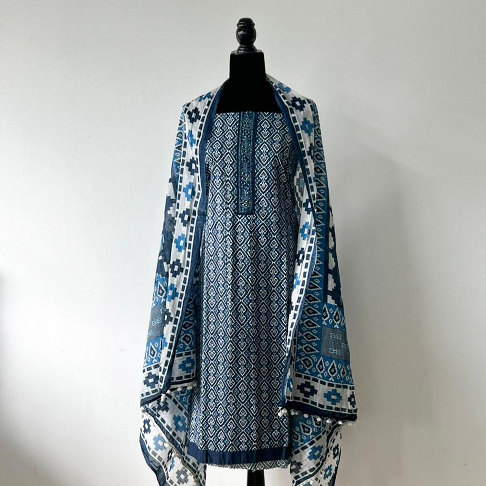 A deep indigo printed unstitched set with a beautifully detailed embroidered neckline. Paired with a solid matching pant material and a soft printed dupatta ideal for daily wear, work days, or calm festive looks.