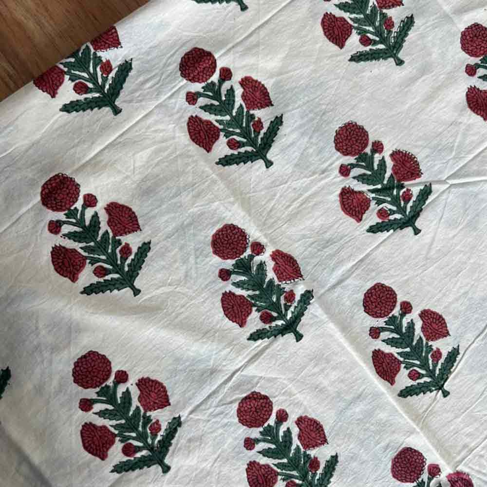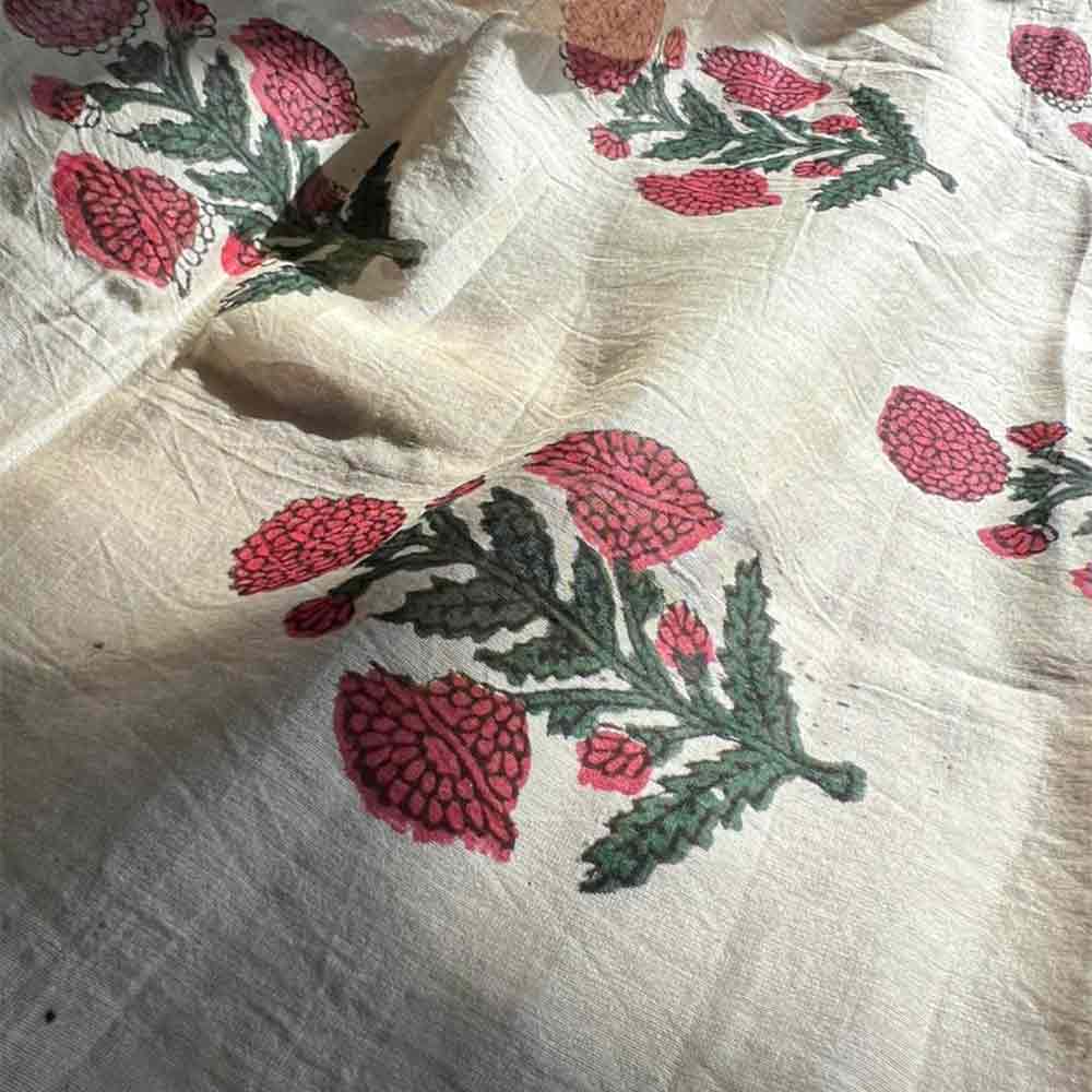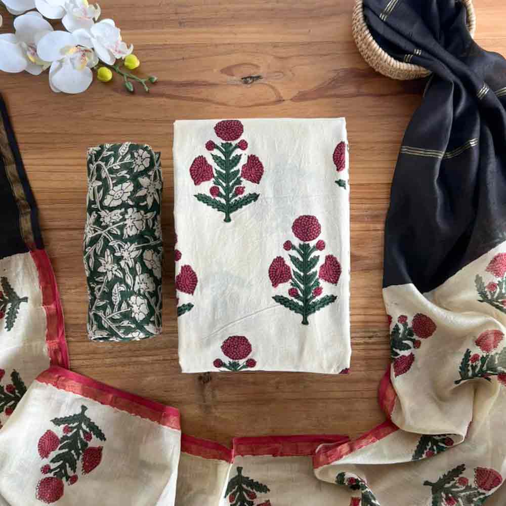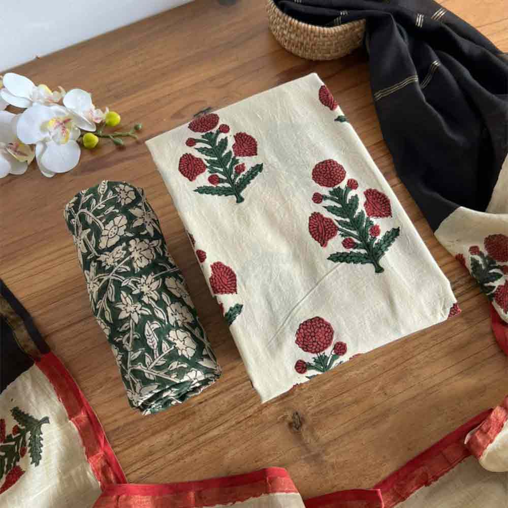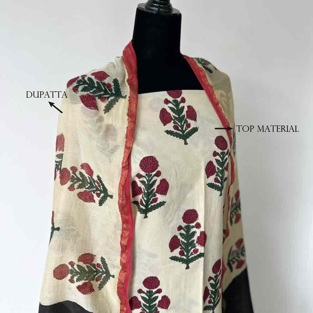 A cream unstitched set featuring bold maroon floral motifs hand-printed across the top and dupatta. The dupatta is bordered with red edging and black contrast panels, paired with a dark green printed pant fabric. A timeless combination of earthy tones ideal for both festive and everyday wear