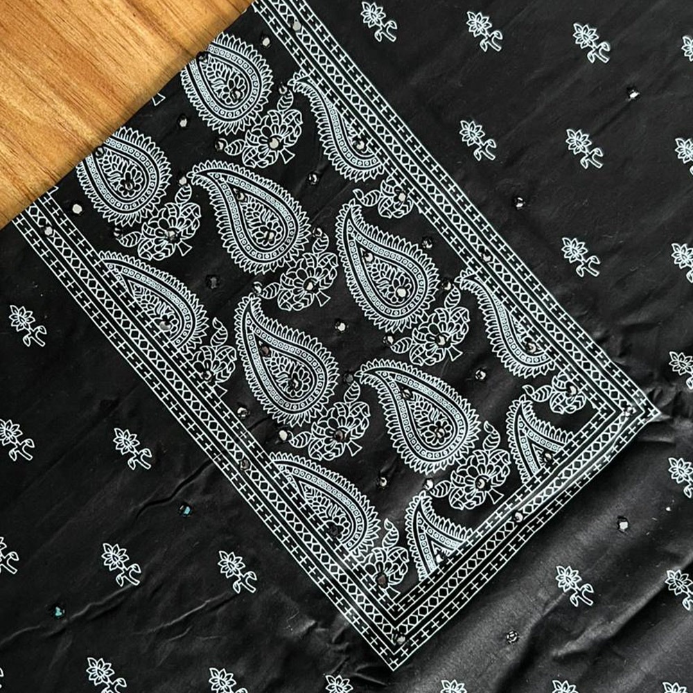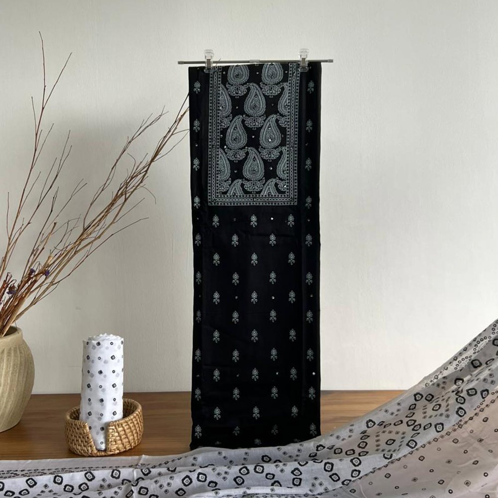 A classic black unstitched set adorned with white paisley prints, paired with a soft white printed dupatta and matching pant material. The contrast detailing and light fabric make it a timeless pick for casual or semi-formal wear
