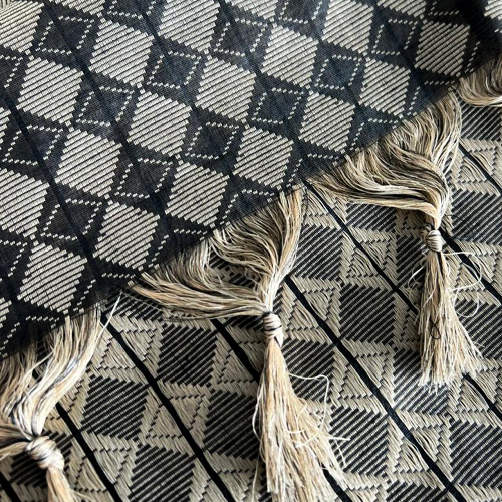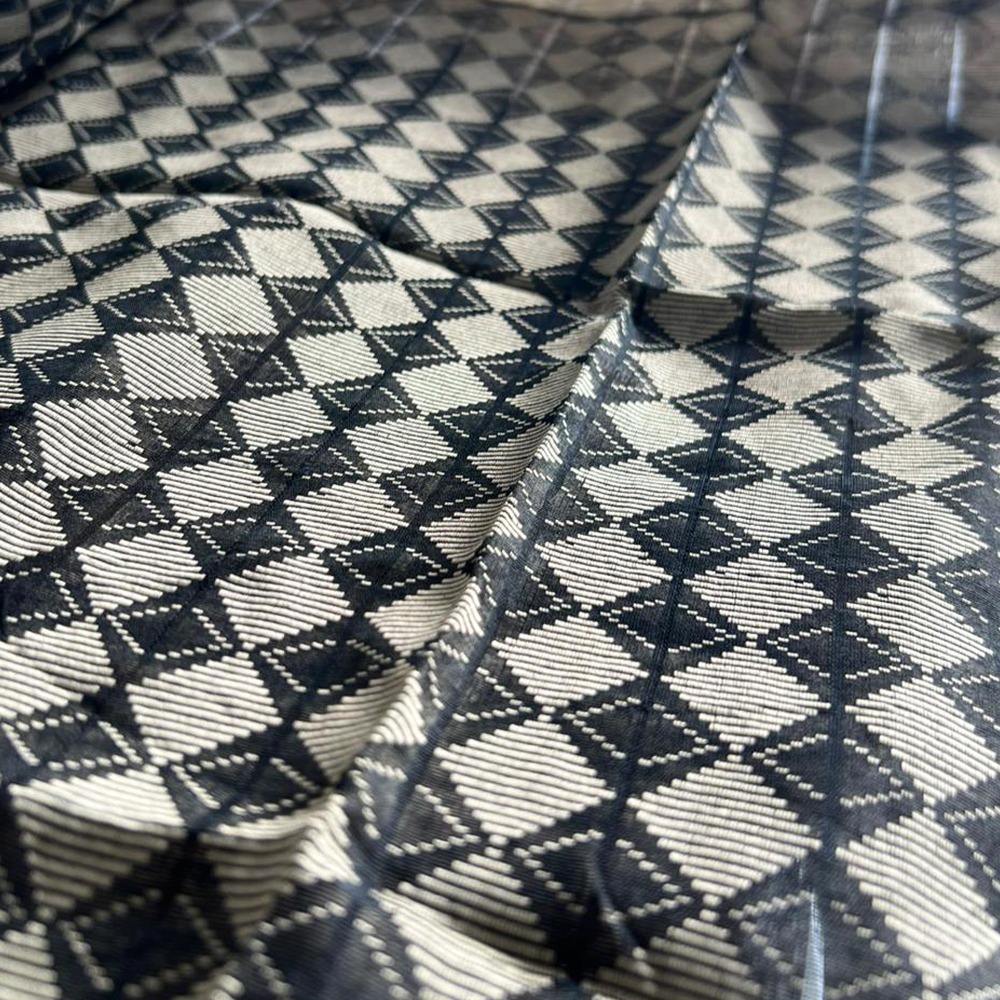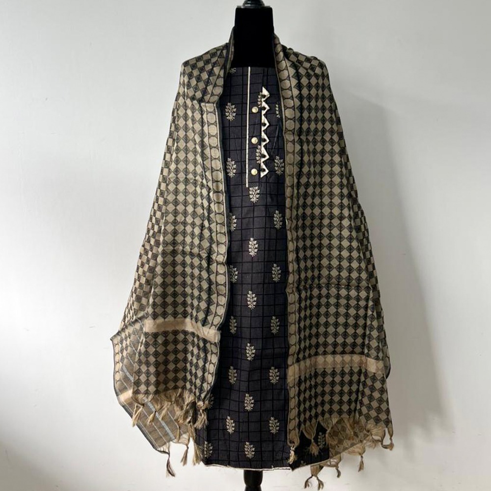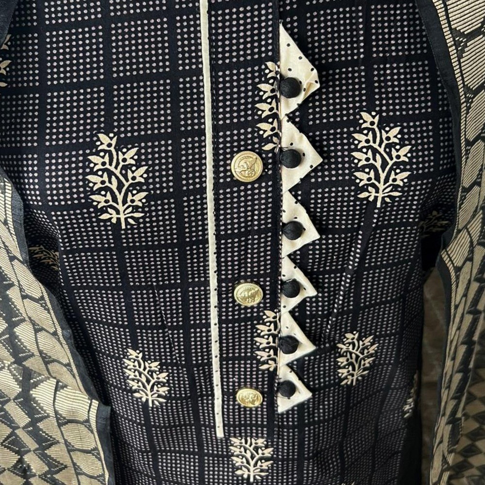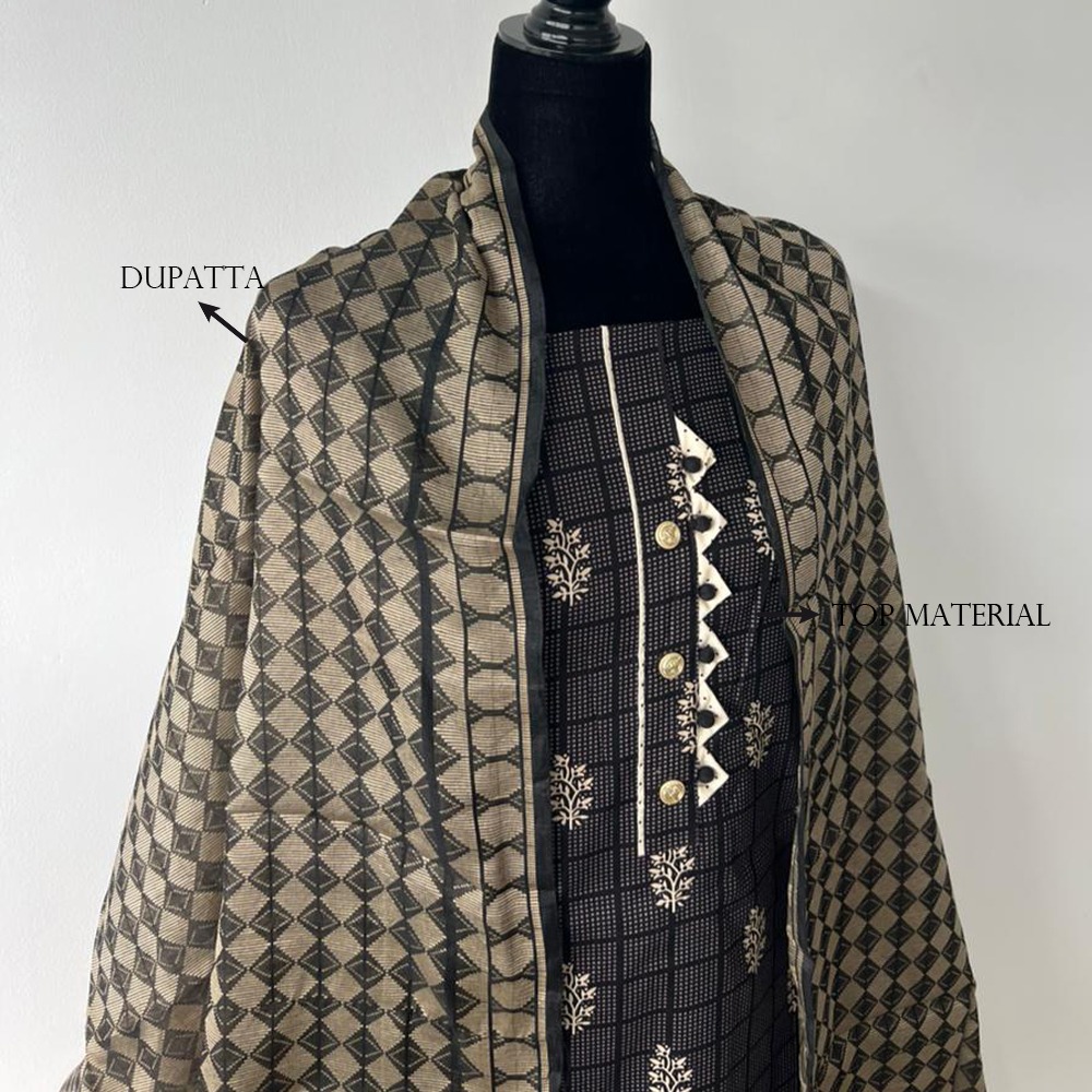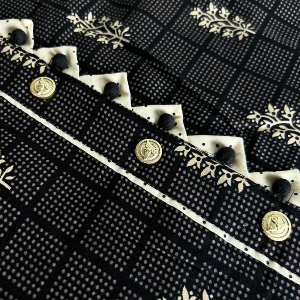 A rich black 3 piece set featuring a gold toned printed kurta with button accents and textured lace detail, paired with a geometric diamond-woven dupatta and soft printed pant material. A bold, balanced look that’s perfect for both day and evening wear.