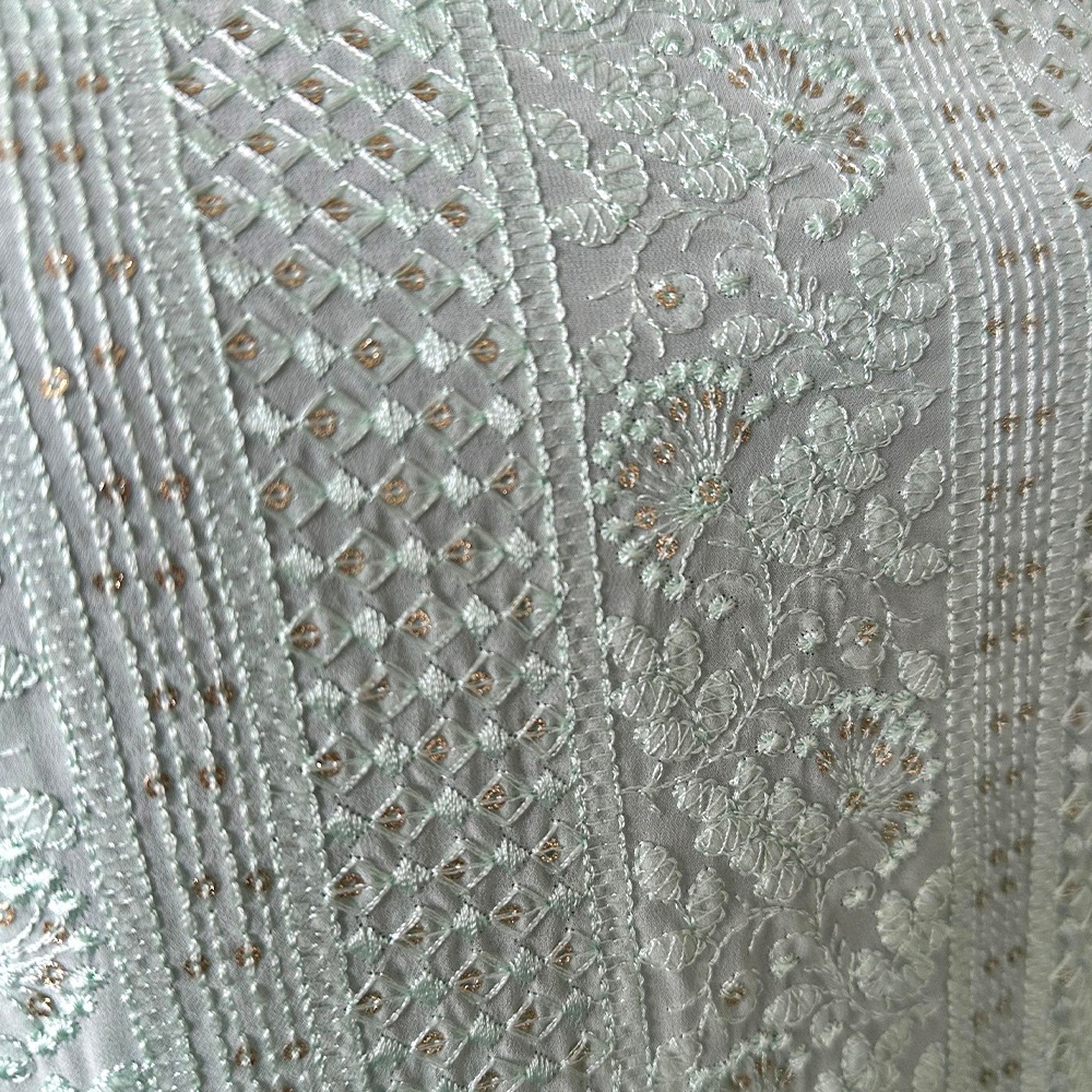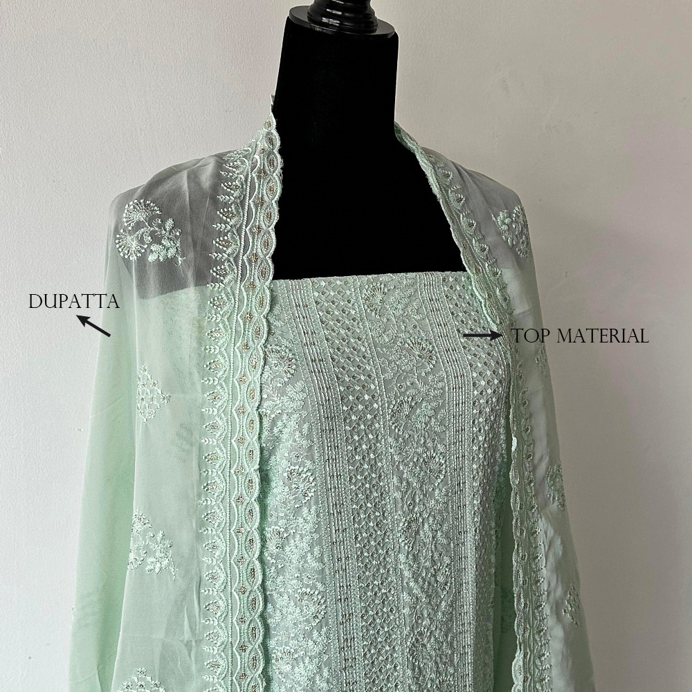 Soft mint green set with detailed chikankari embroidery and a sheer matching dupatta. Comes with smooth pant material, perfect for tailoring. Subtle shimmer accents add a graceful touch. Perfect for gifting to a loved one or yourself!