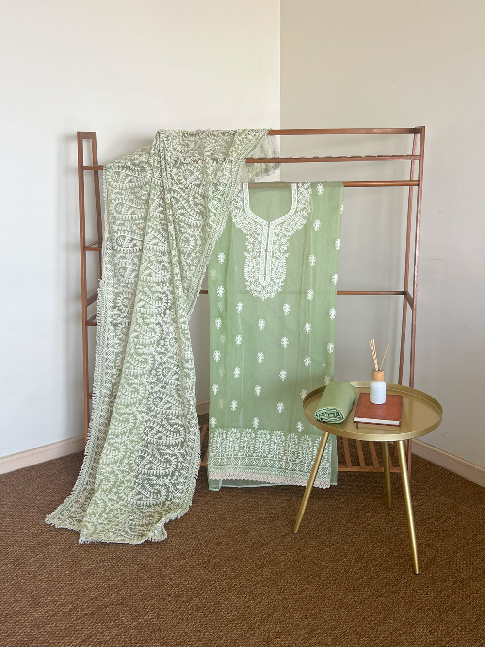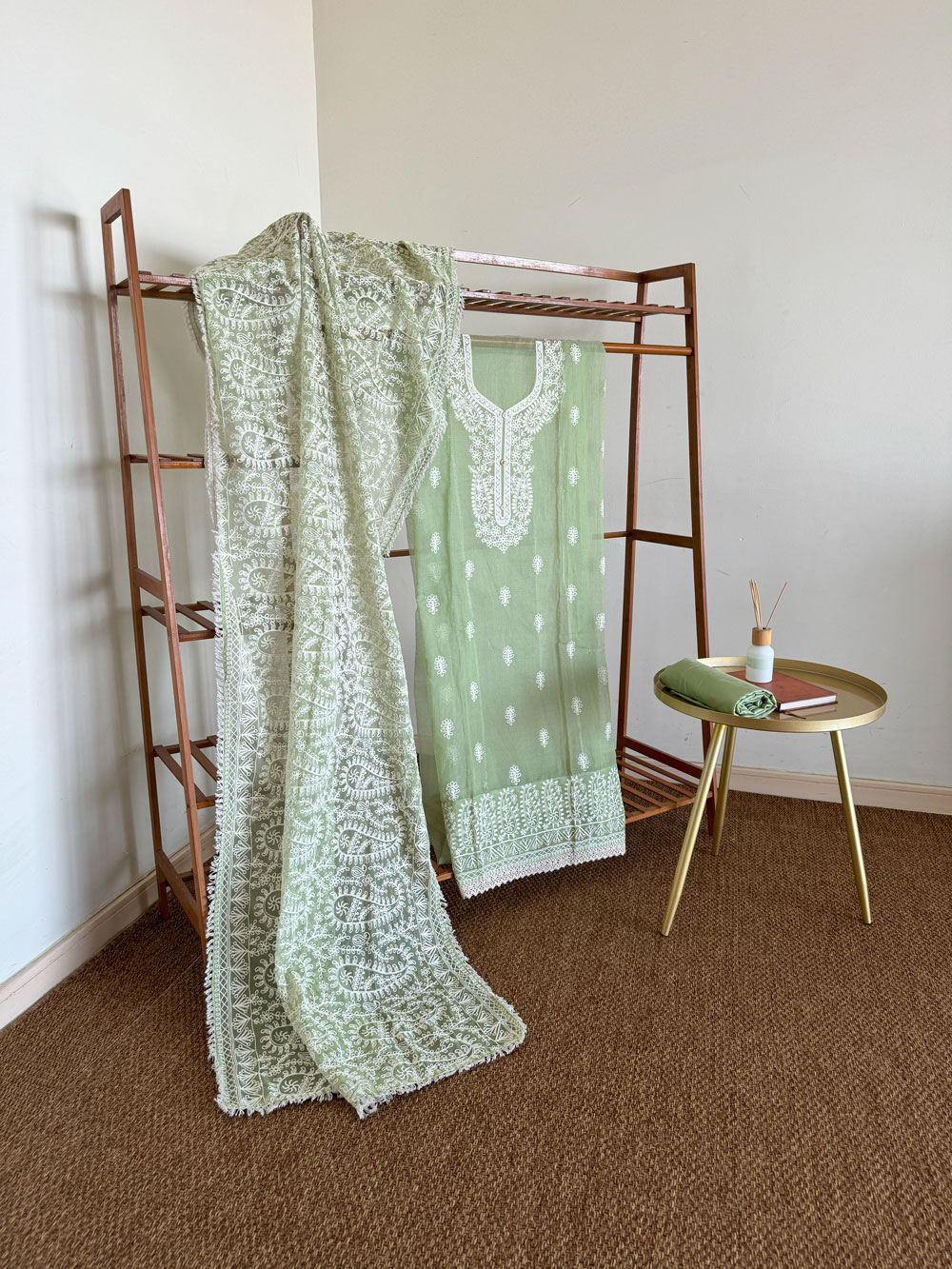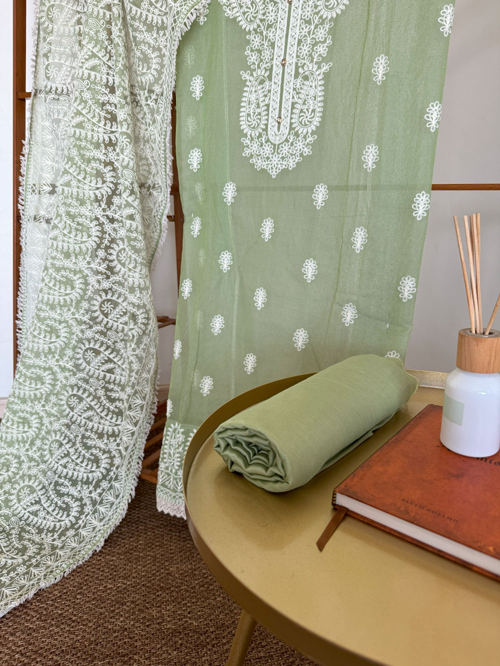 A breezy mint green unstitched material set showcasing delicate white embroidery on both the chiffon top and dupatta. Paired with soft silk pant material, this set is lightweight, versatile, and ready to be tailored your way.