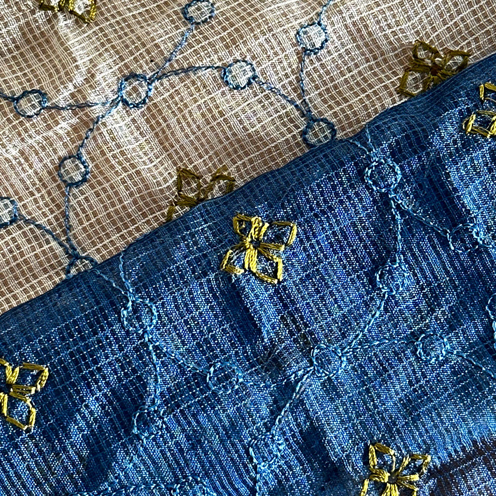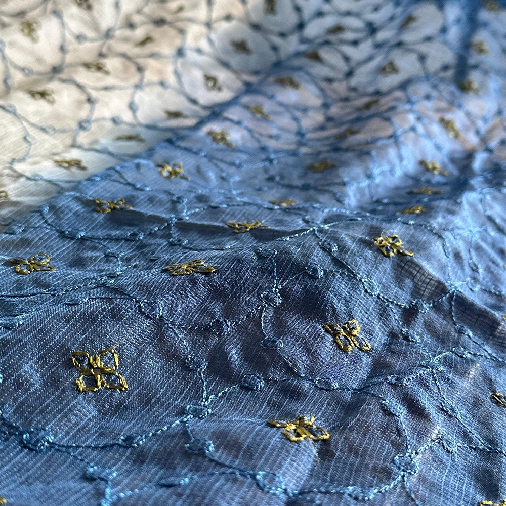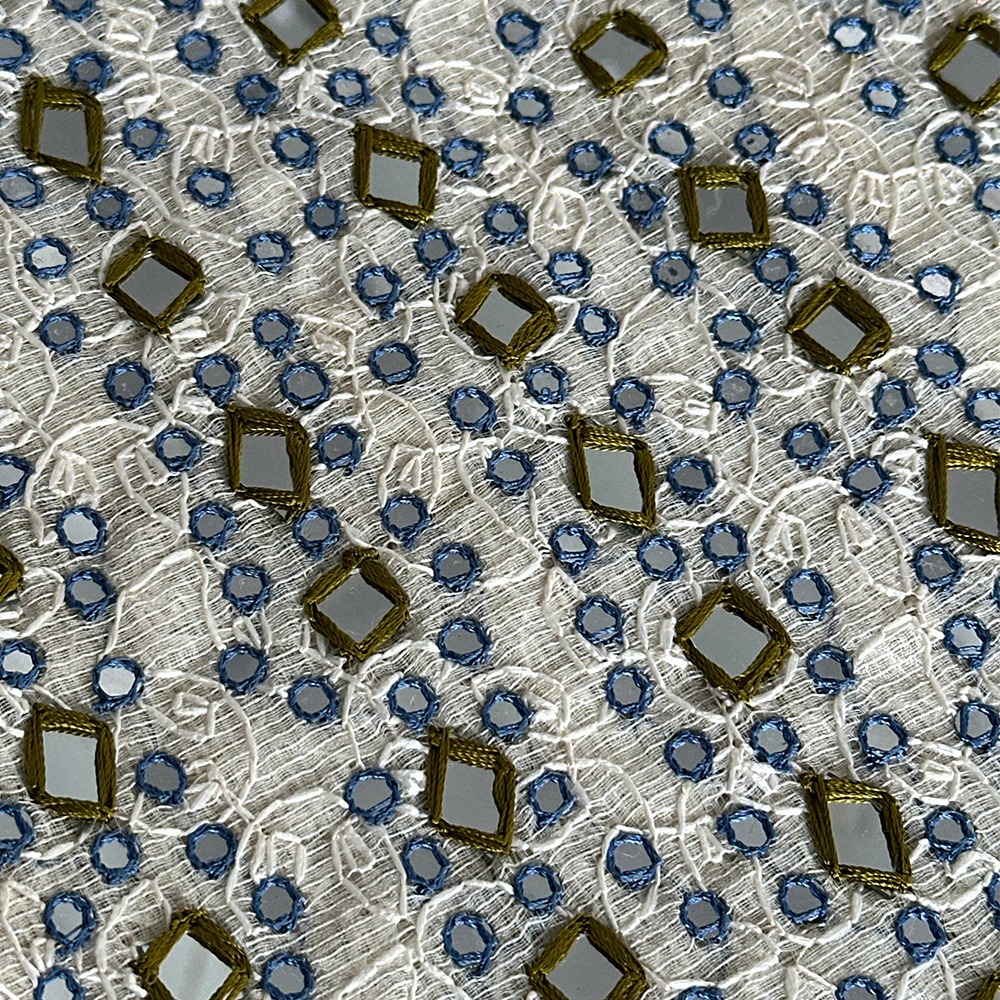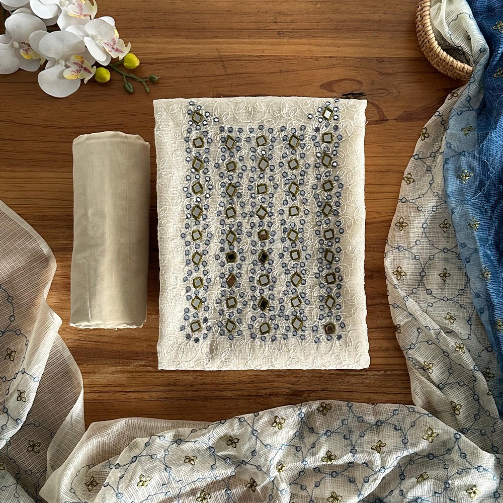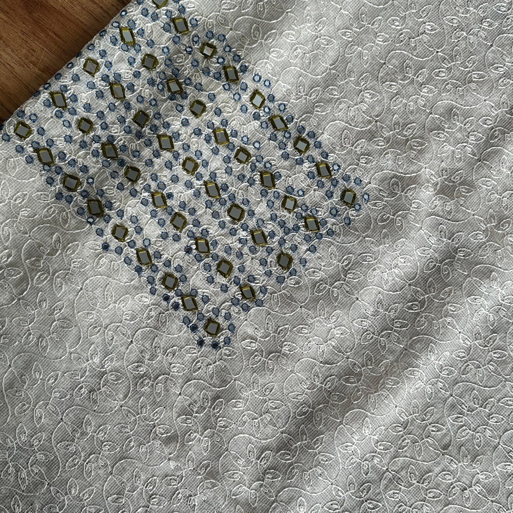 A white unstitched 3-piece set with blue and olive floral Aari embroidery and mirror detailing on the top. Comes with a plain cream pant fabric and a sheer dual-tone dupatta with soft gold thread work. Light, festive, and easy to style.
