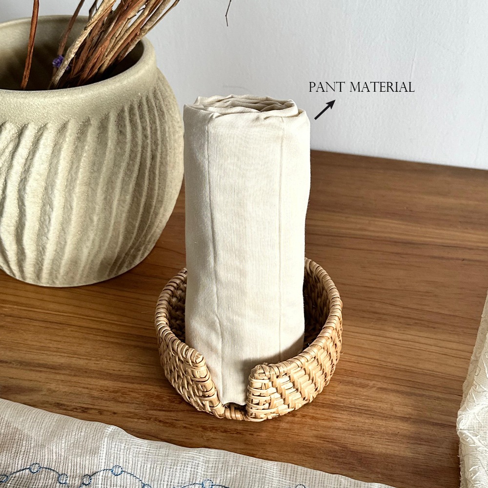• Unstitched 3-piece material set with beige floral printed top, plain navy pant material, and indigo patterned dupatta with tassels laid flat on a wooden table.