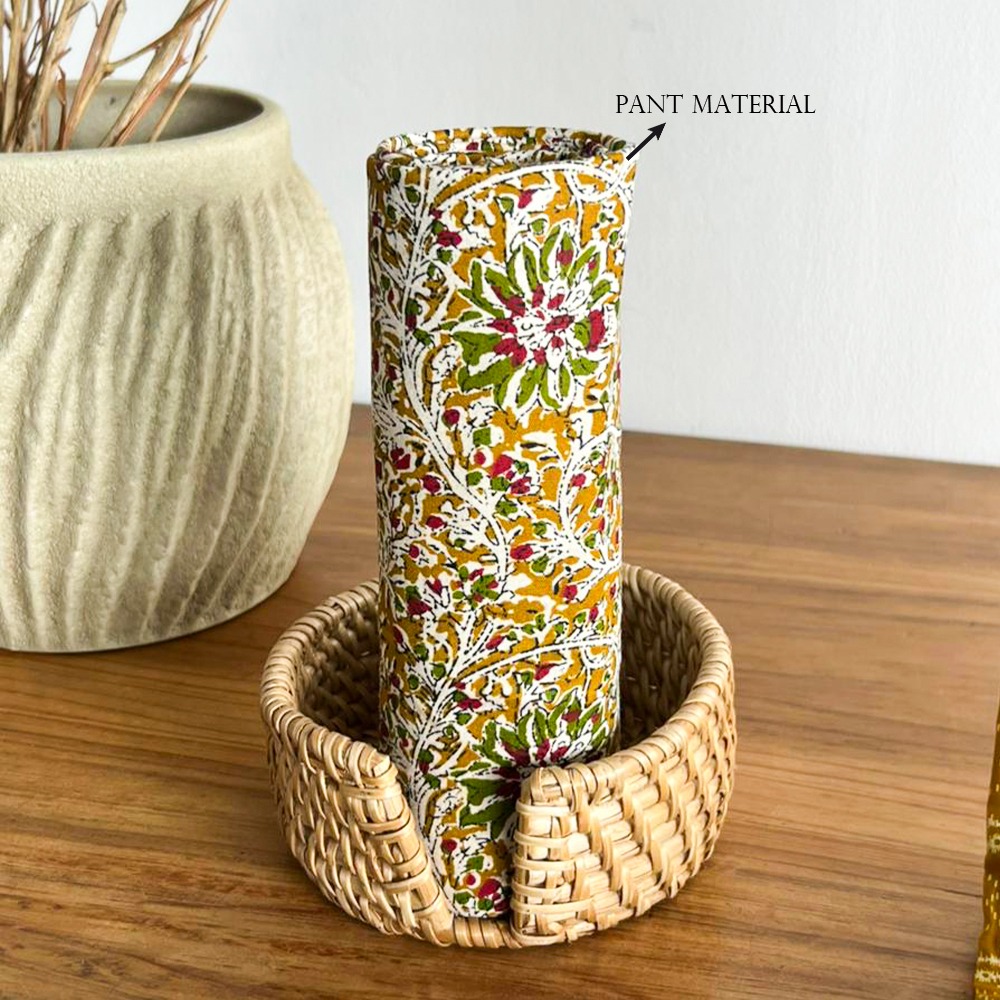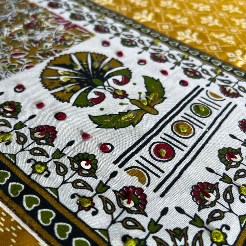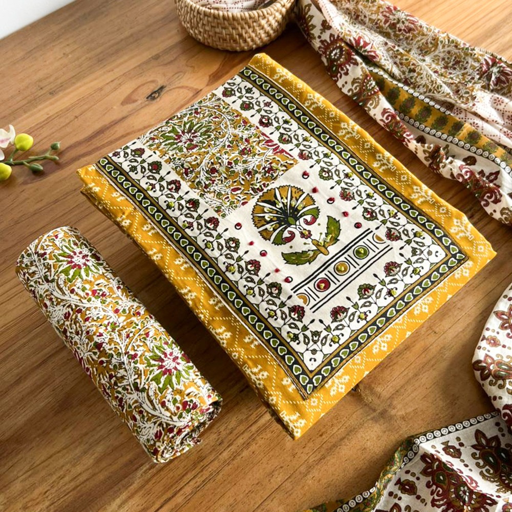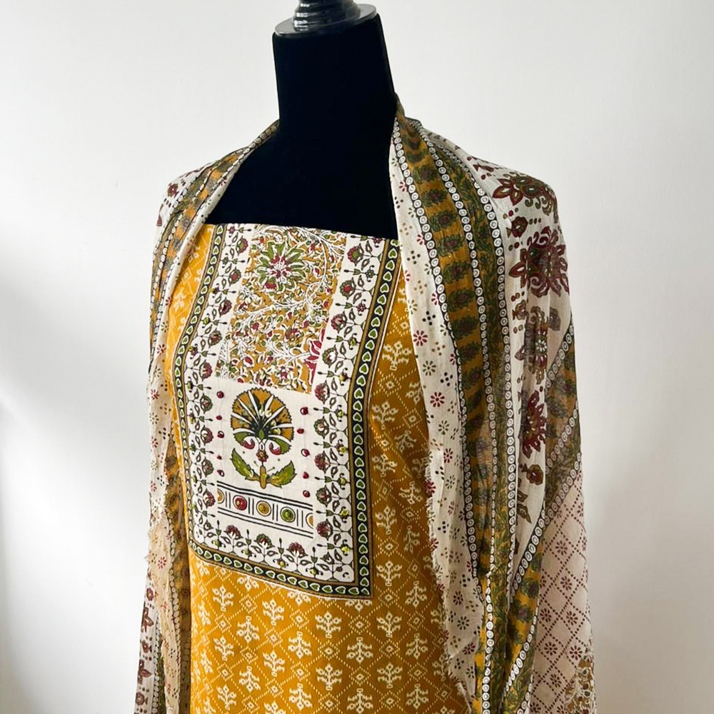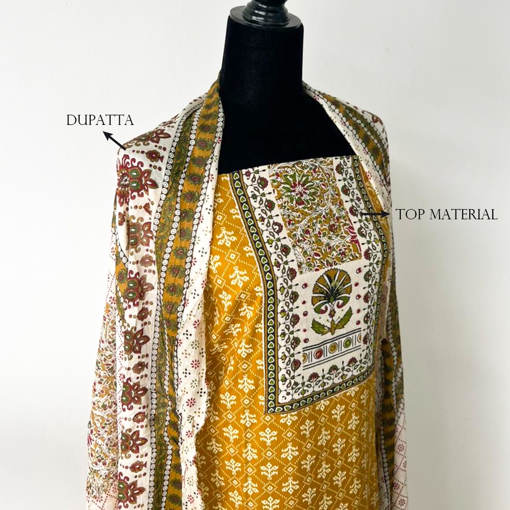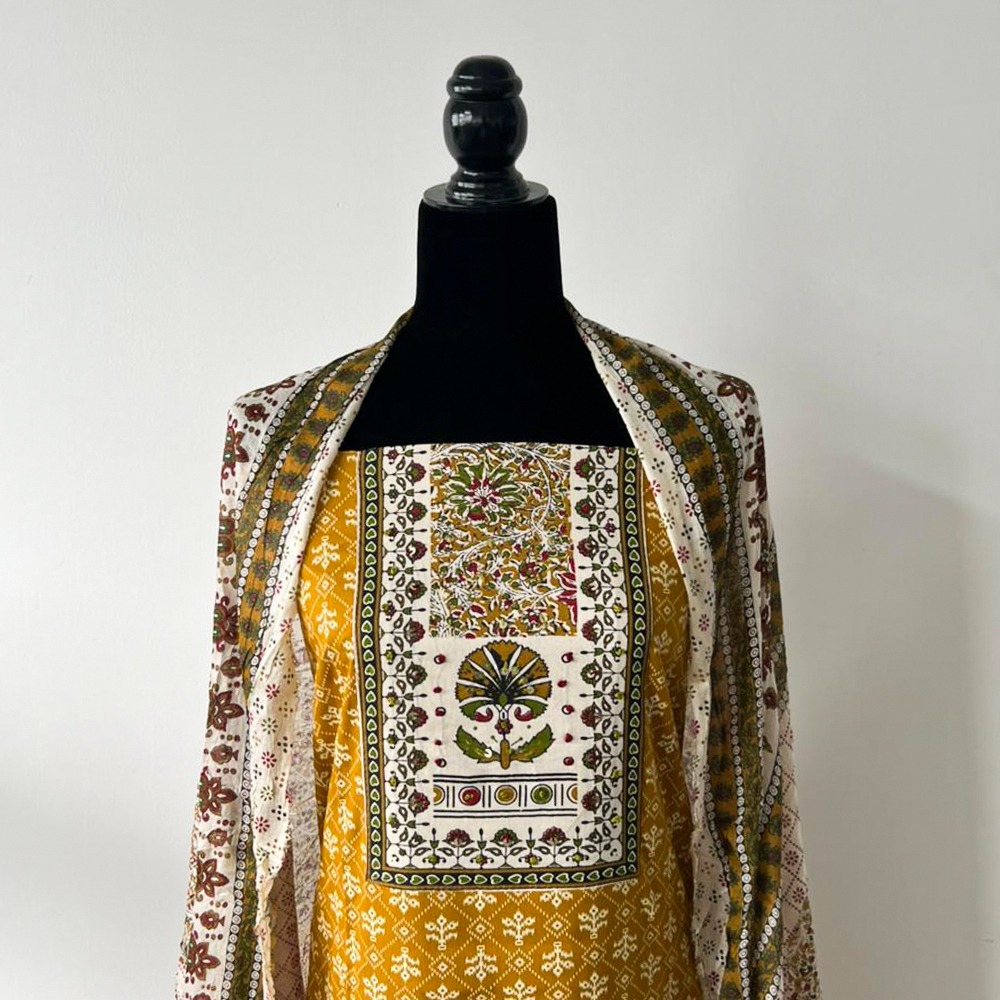 A warm mustard yellow unstitched set featuring traditional block prints and a detailed front design with floral and tree motifs. Comes with a soft printed dupatta and matching pant material. Easy to wear and perfect for everyday comfort or casual get-togethers.