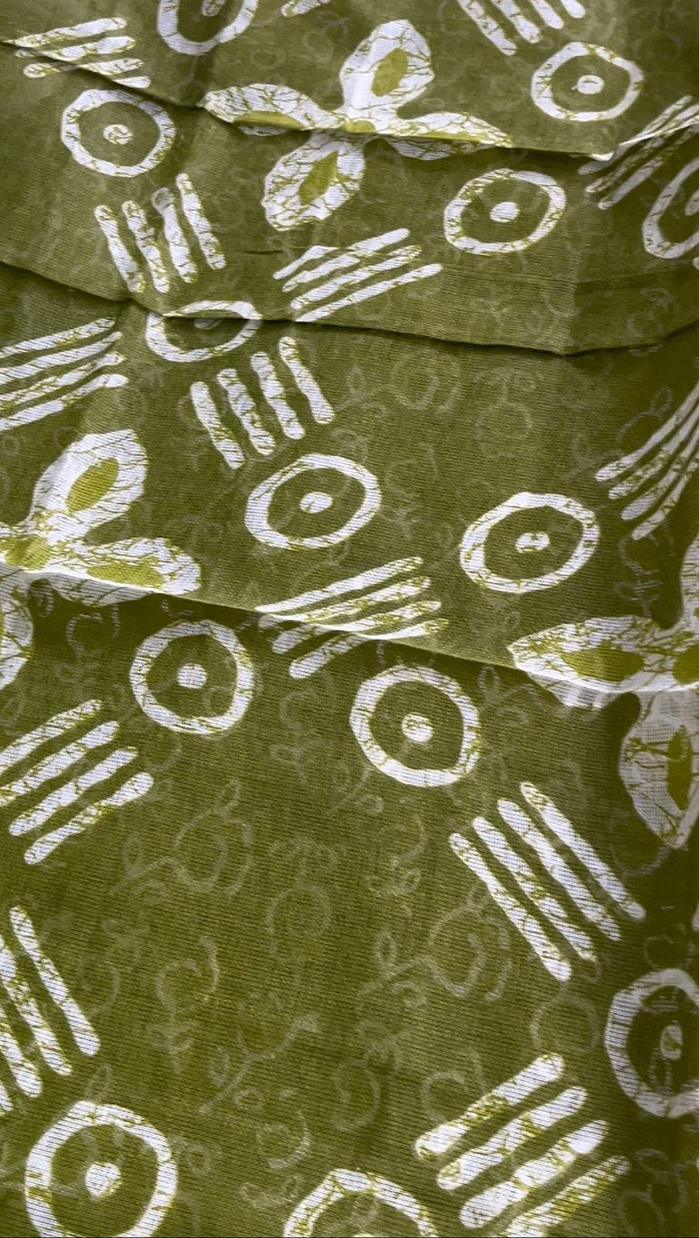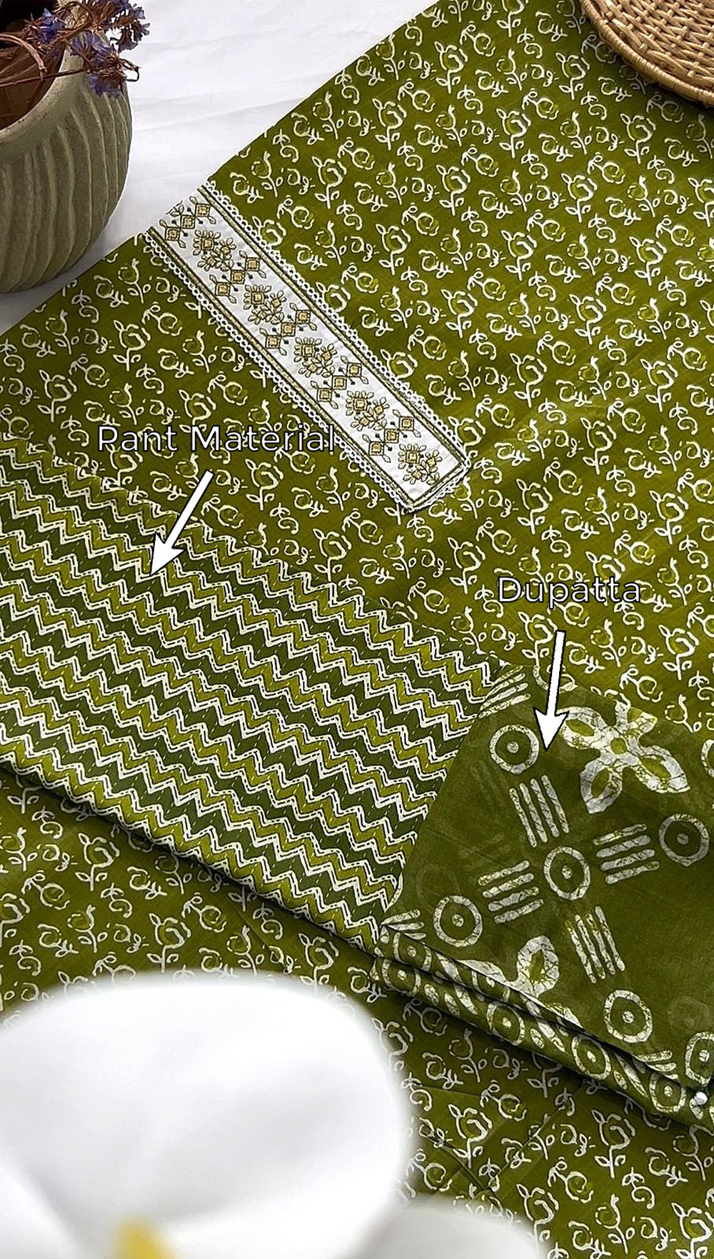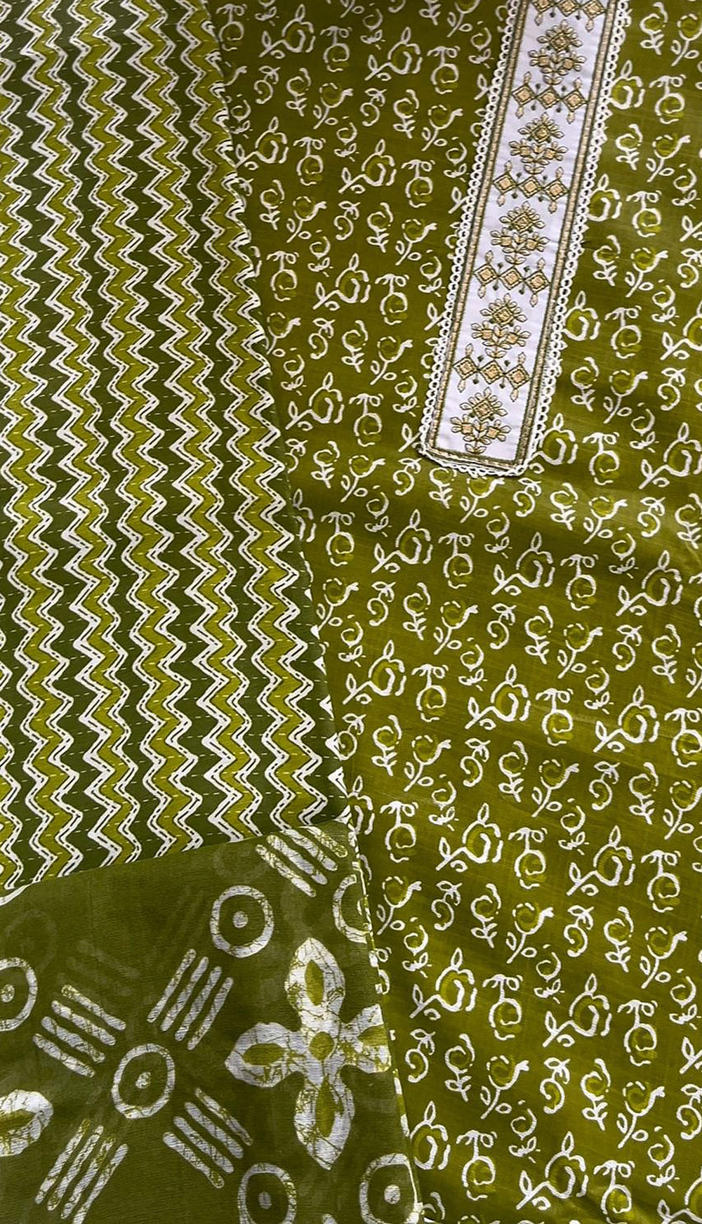 An unstitched olive green material set featuring a floral printed cotton top, zigzag patterned pant material, and a matching mal cotton dupatta with block prints. Lightweight and breezy, it’s an ideal choice for everyday wear.