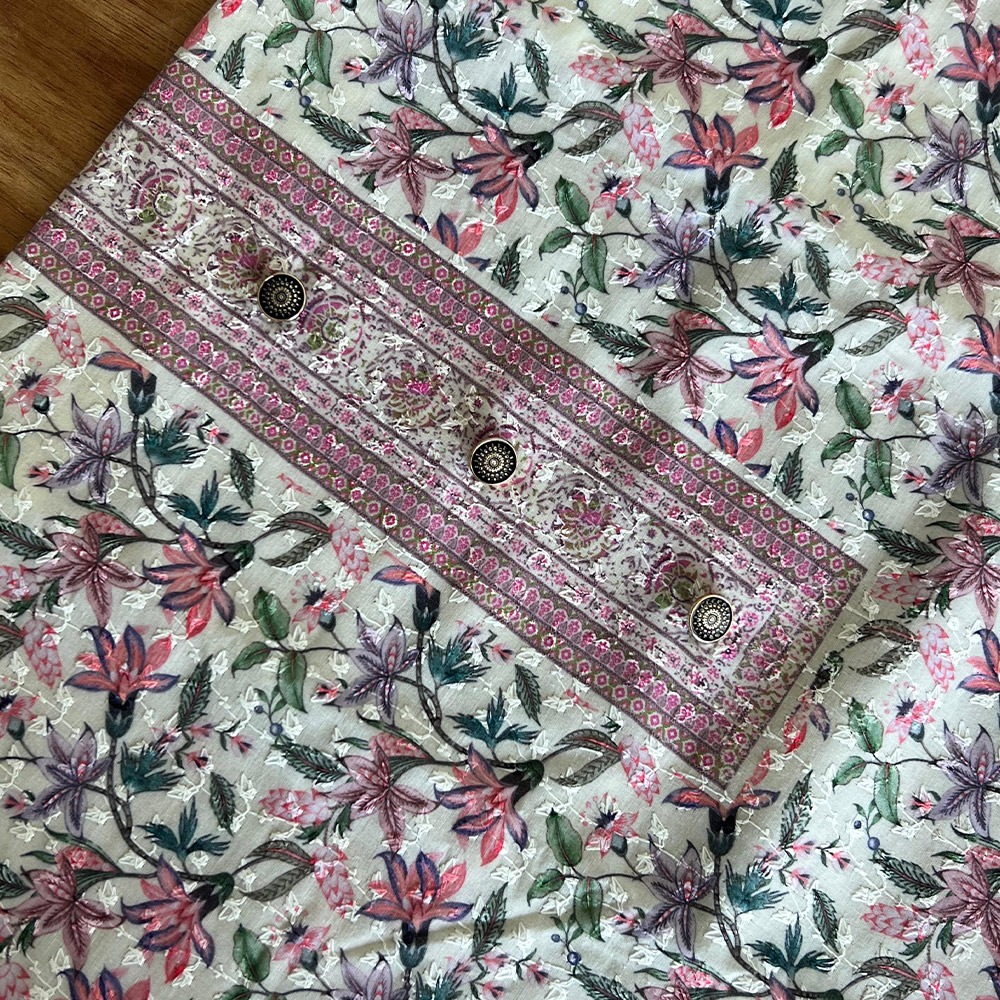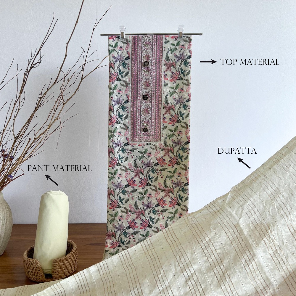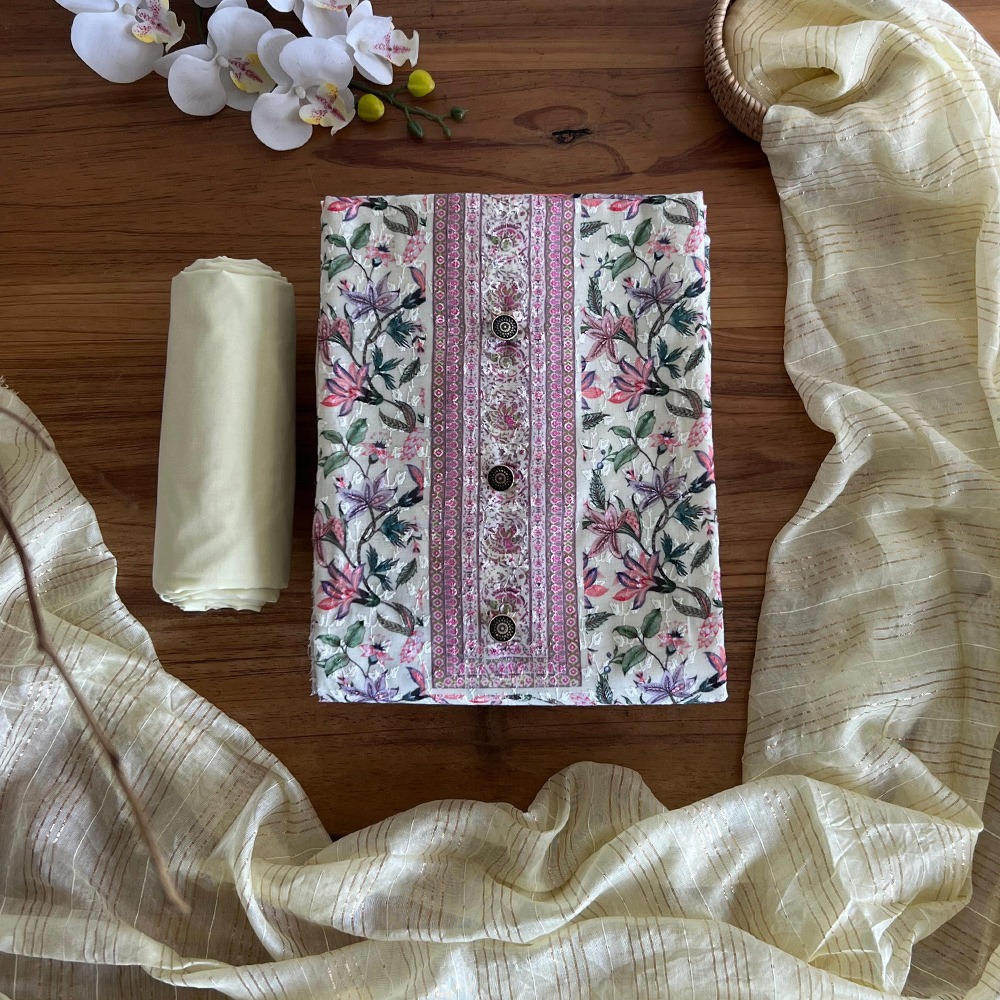 A cream base with soft pink floral block prints and button detailing on the top. Paired with a plain pant material and a striped dupatta with subtle shimmer accents. A gentle, graceful set for everyday dressing.