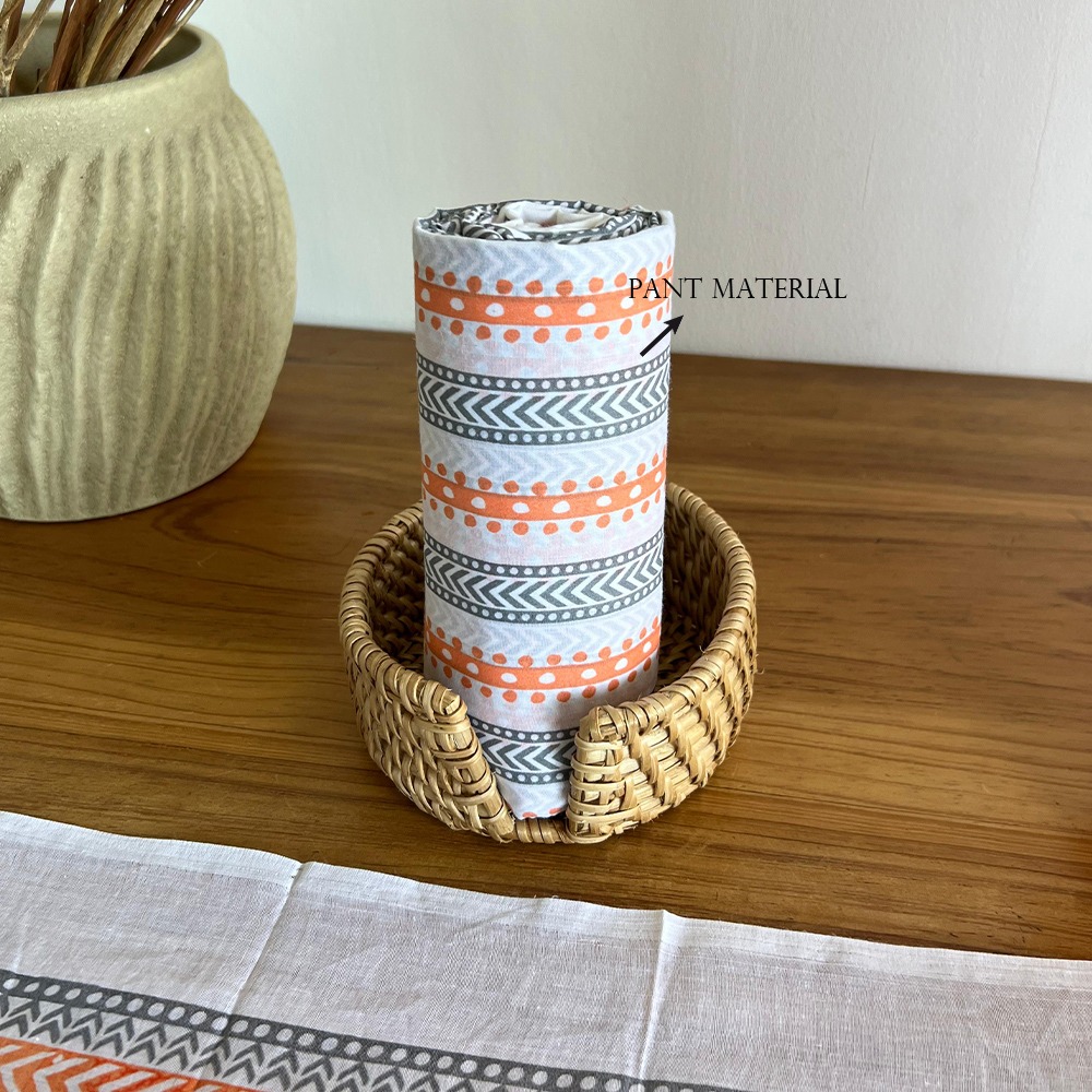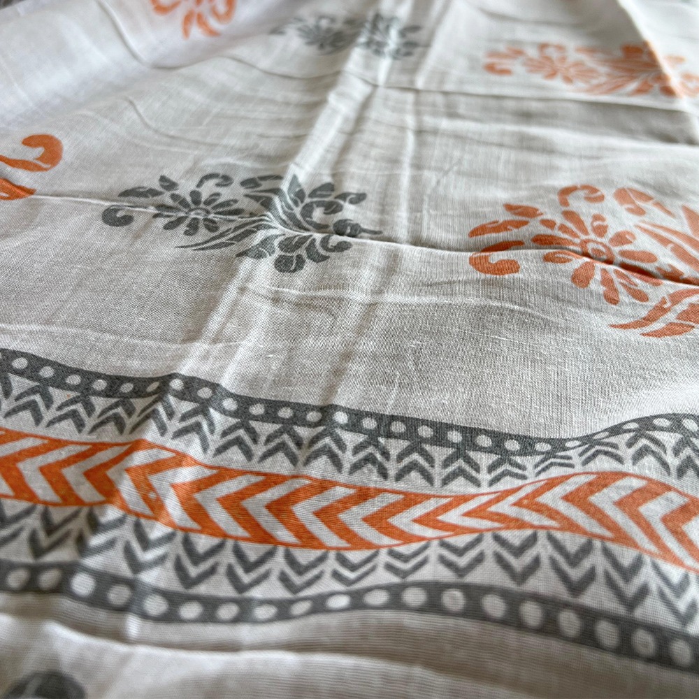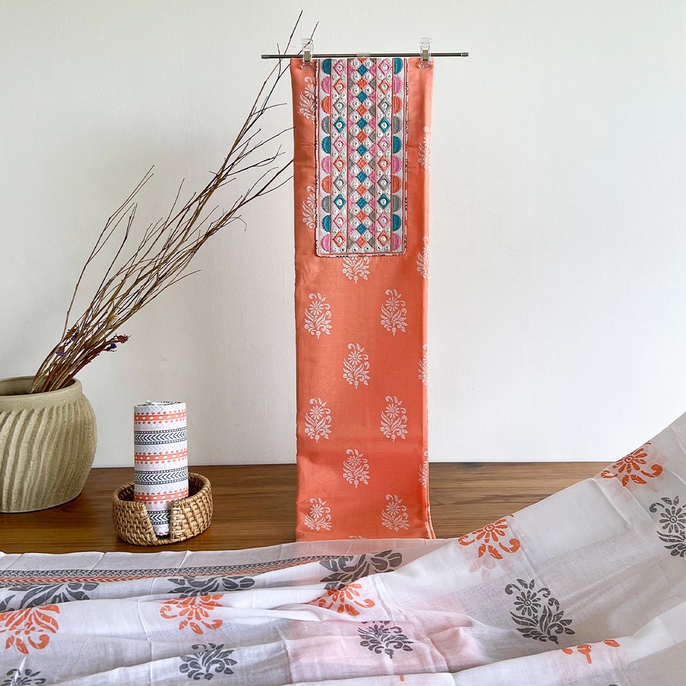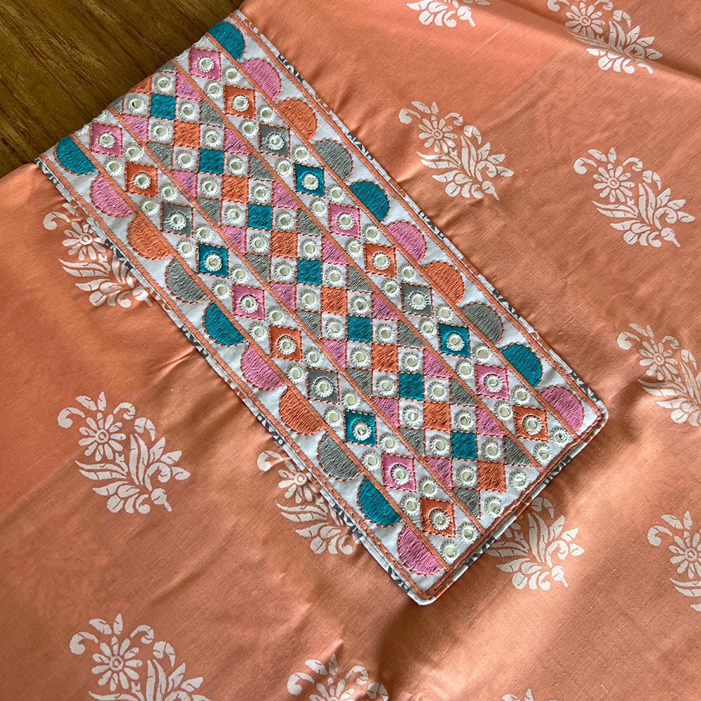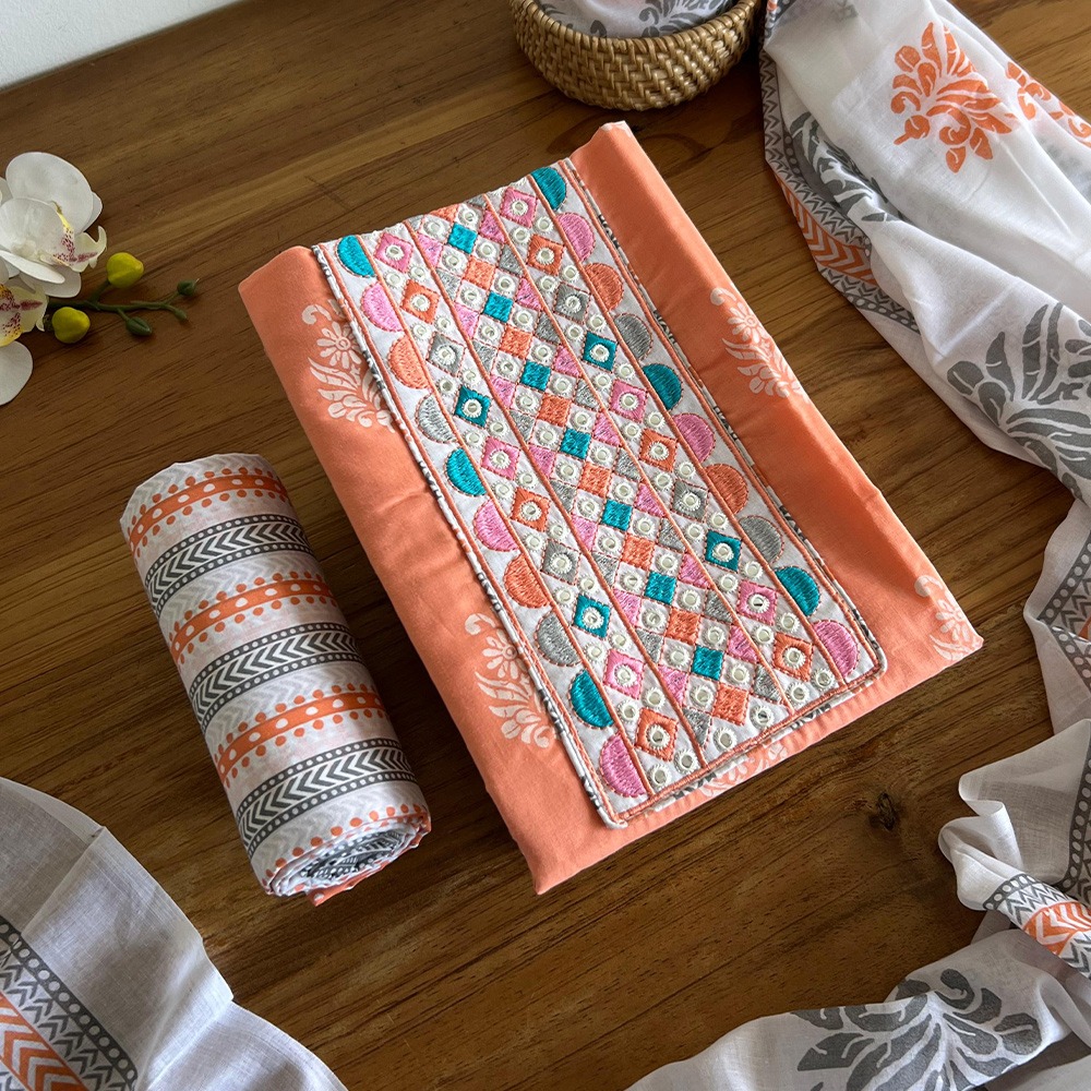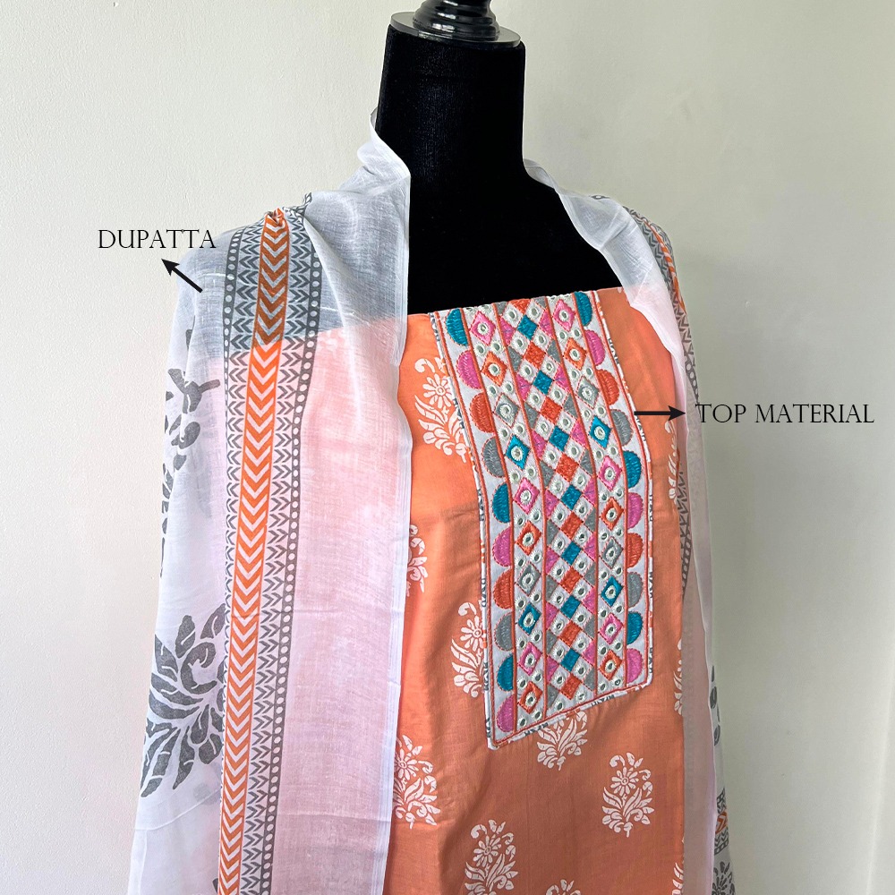 A vibrant orange unstitched material set featuring a cotton top with intricate multicolour embroidered patterns, paired with a printed cotton pant material. The look is completed with a soft mal cotton dupatta in white and grey, detailed with bold floral and geometric prints. A lively and versatile set, perfect for everyday or casual festive wear.