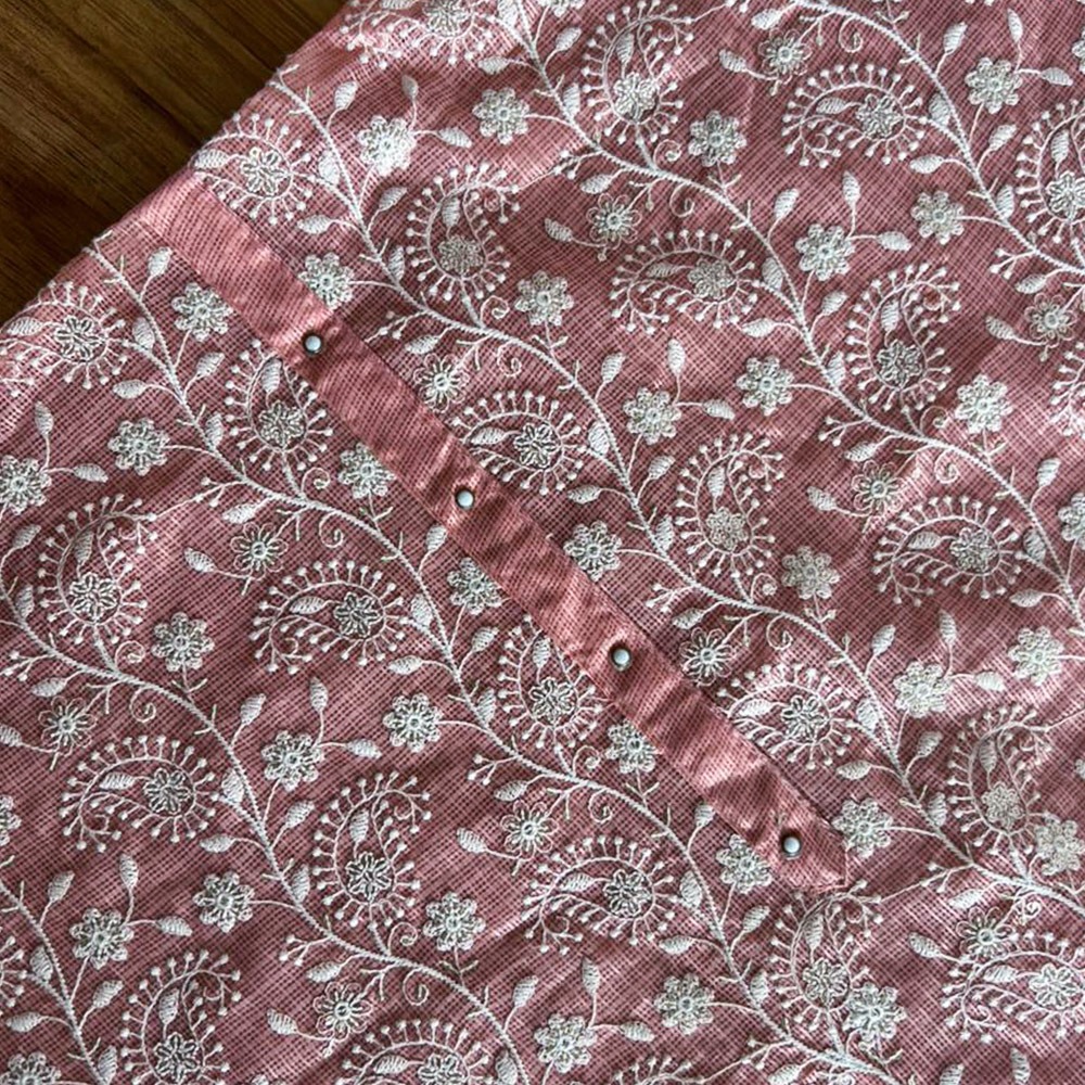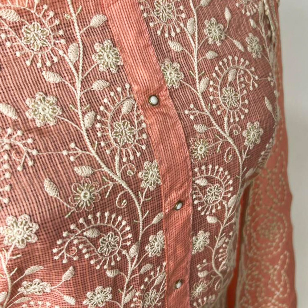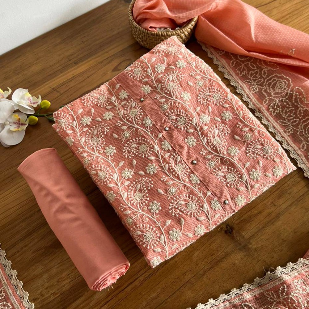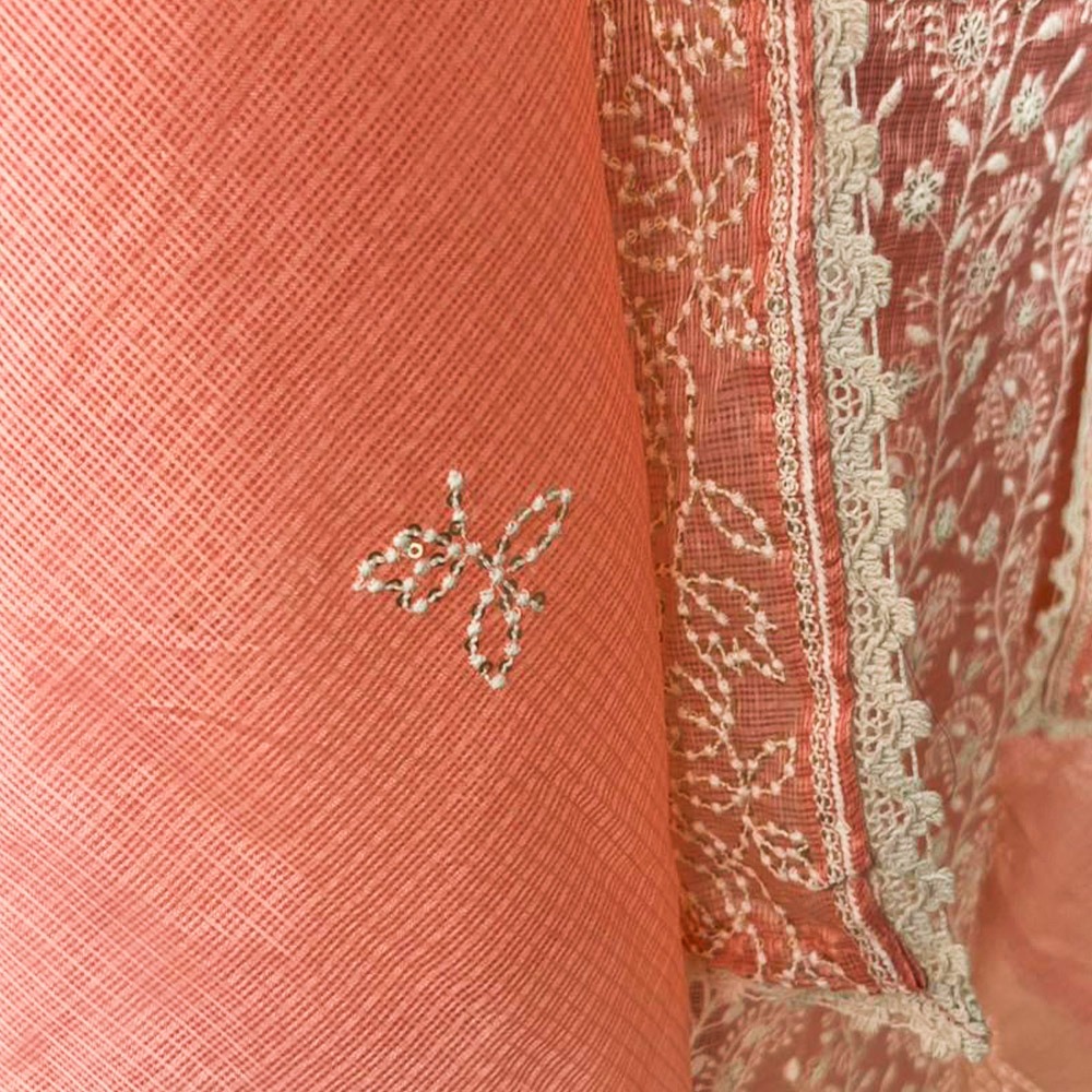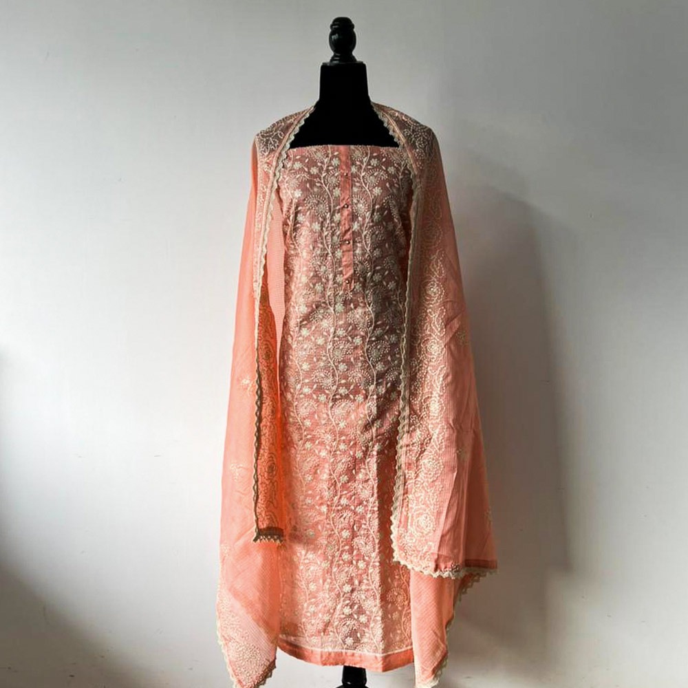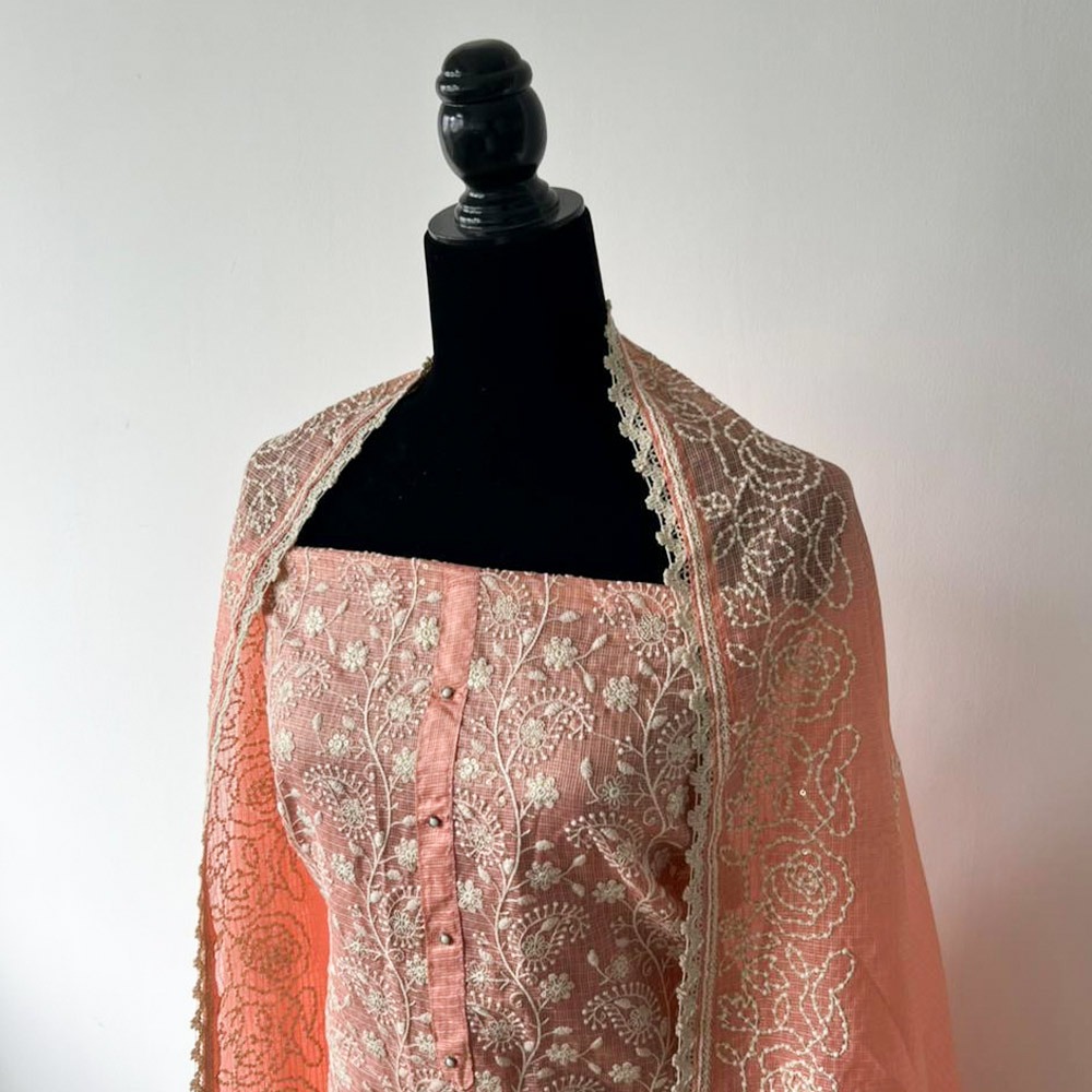 A delicate peach unstitched set adorned with intricate white thread embroidery and small pearl buttons on the neckline. Paired with a beautifully bordered dupatta and plain matching pant material. Soft, breathable, and perfect for daytime occasions or festive gatherings.