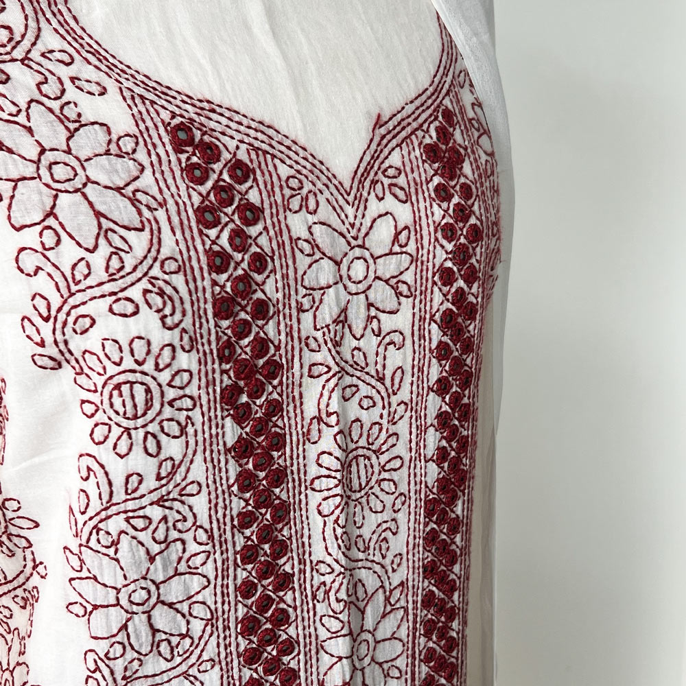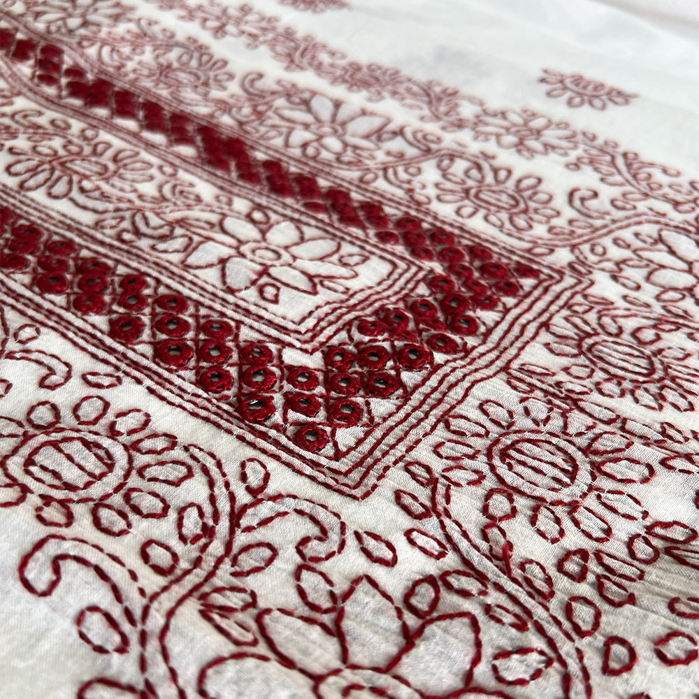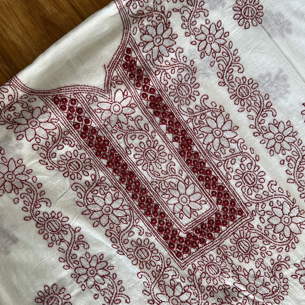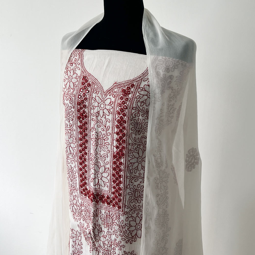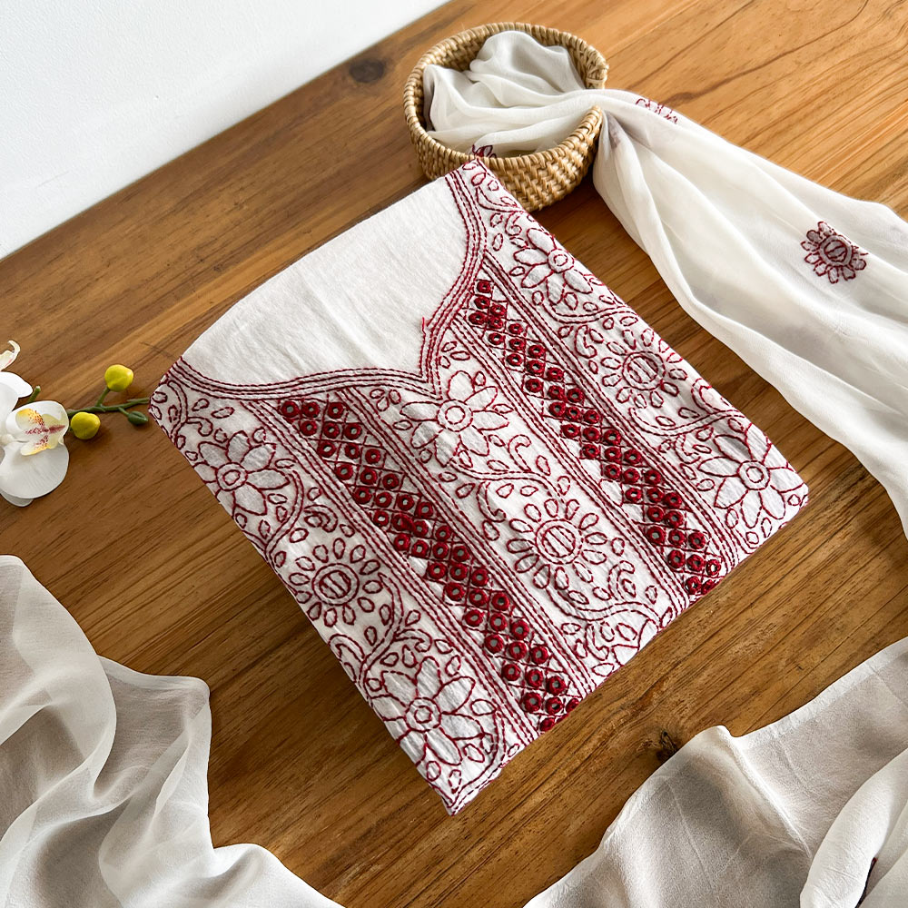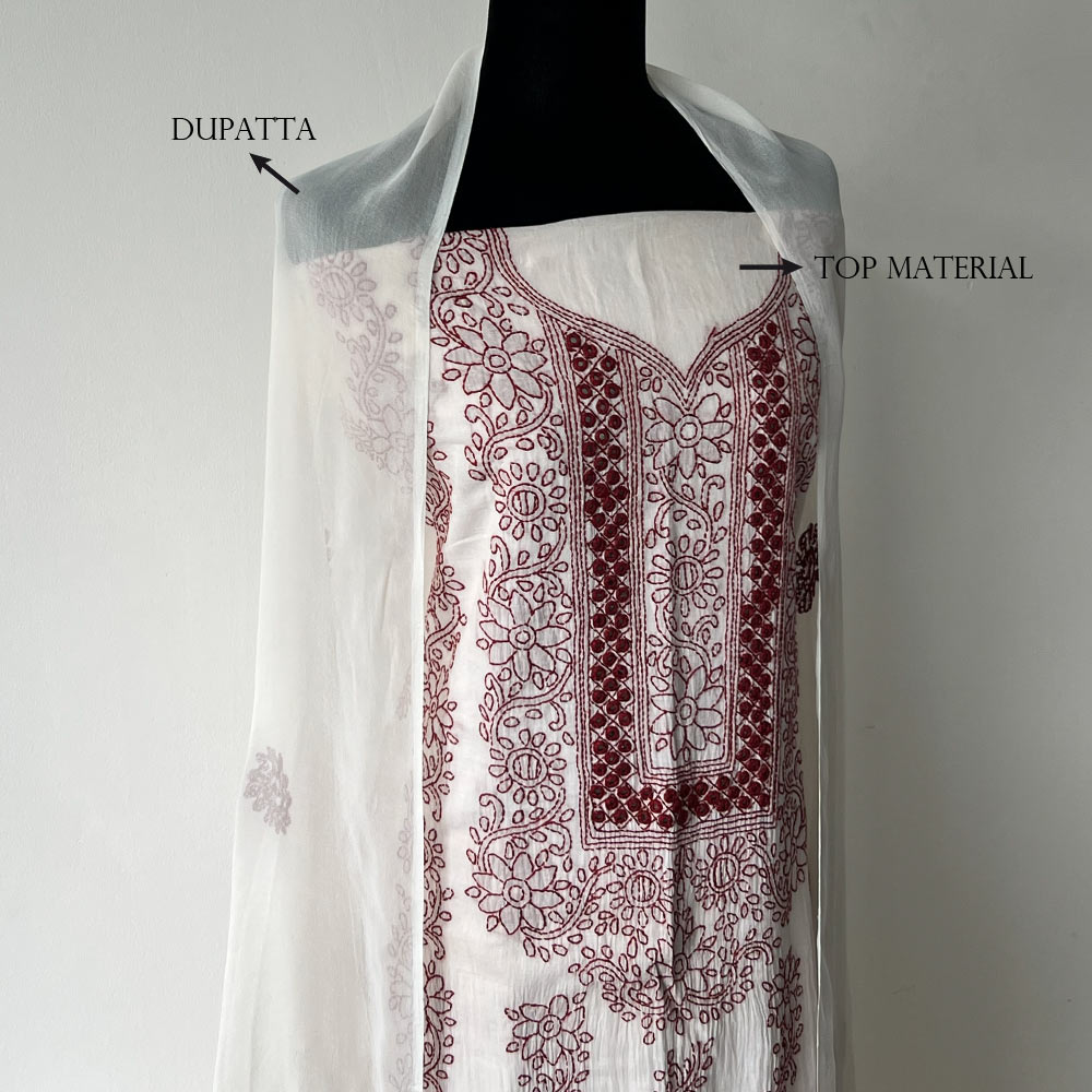 Unstitched three-piece material set featuring a white top with plum-coloured floral embroidery. Comes with a soft sheer dupatta with matching embroidered motifs and a plain pant material. Suitable for everyday wear and small occasions.