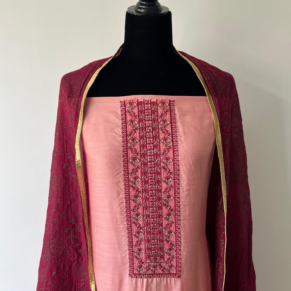 Categories:Embellished and Embroidered, Unstitched Tags:everyday ethnic, maroon dupatta, rose peach suit, unstitched 3-piece