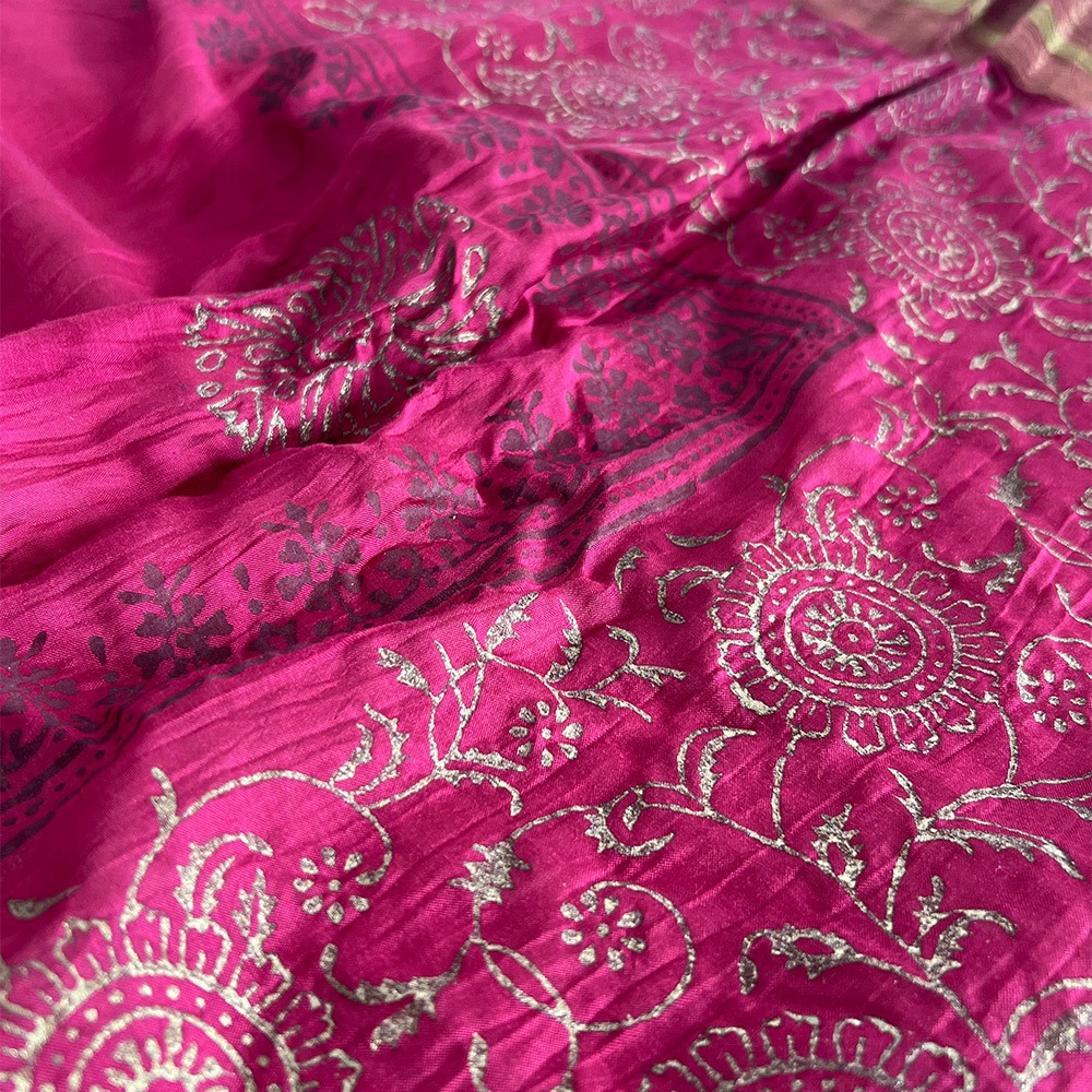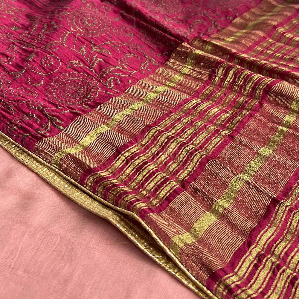 A rose-peach top with rich maroon embroidery at the front. Comes with a plain matching pant material and a maroon dupatta featuring gold-toned woven patterns. Easy to wear and style for any day.