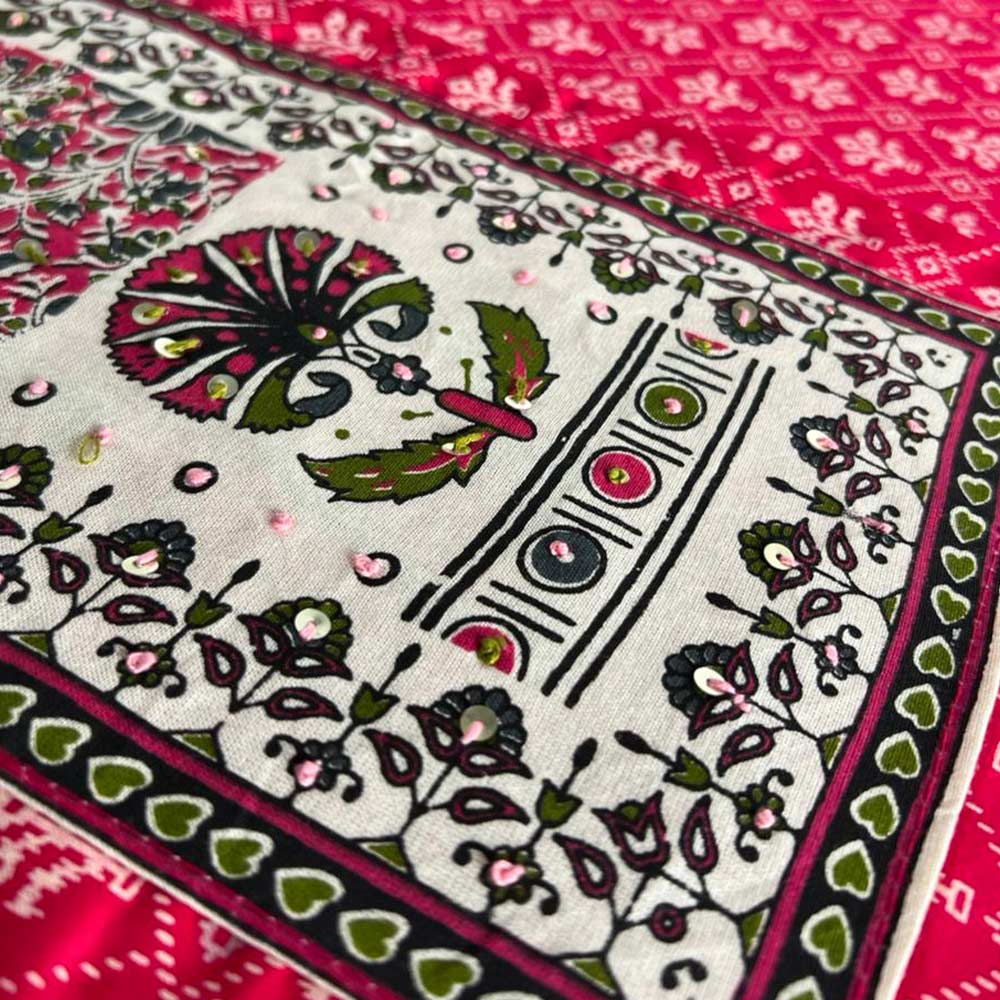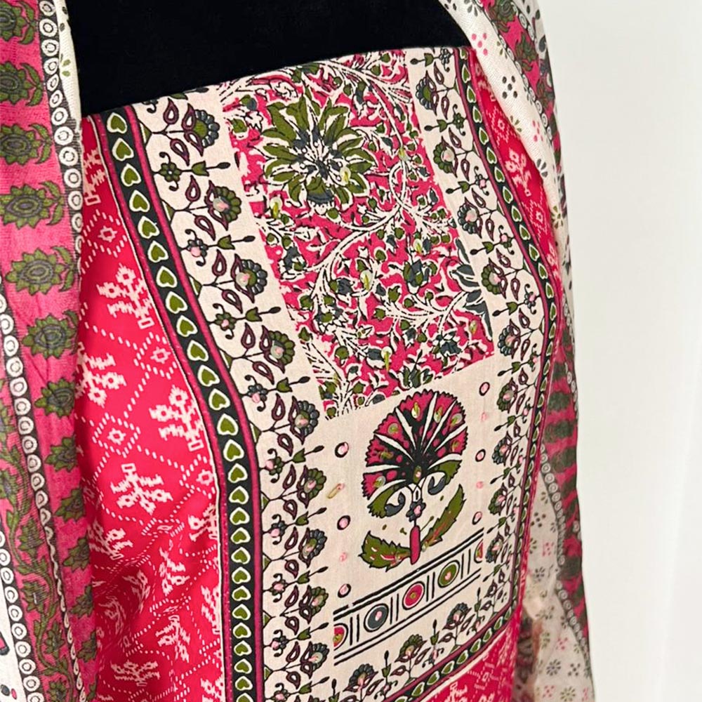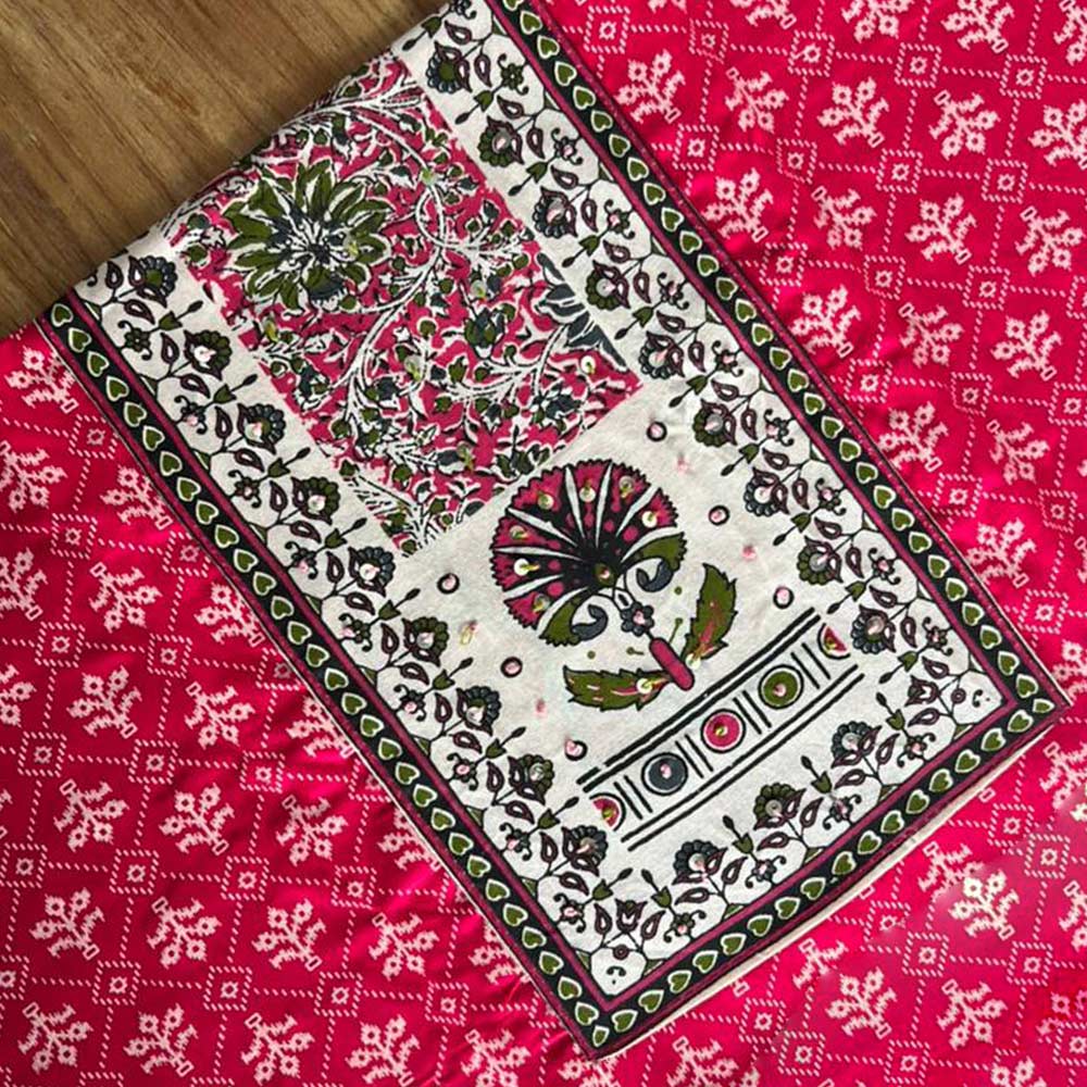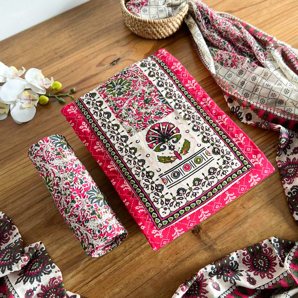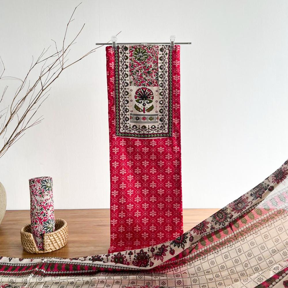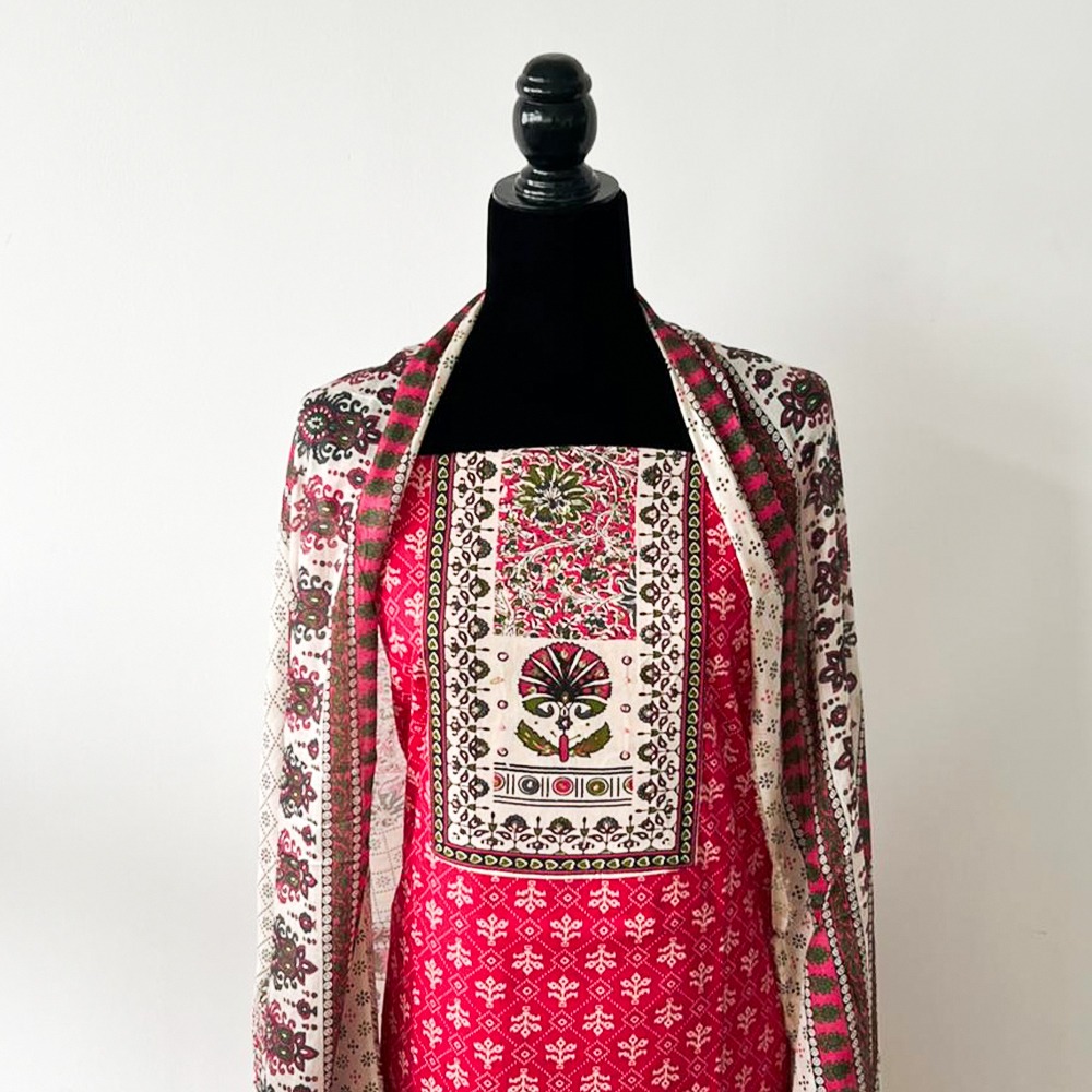 A rose red block print unstitched 3-piece set featuring detailed prints on the top. Paired with a matching printed dupatta and a coordinating pant piece. Comfortable, breathable, and suitable for daily wear or casual outings.