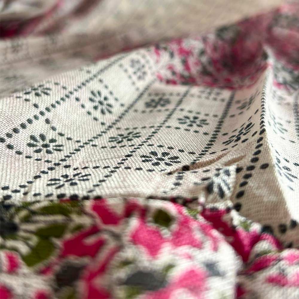 • Unstitched 3-piece set with beige floral printed top, plain dark brown pant material, and a tribal printed dupatta with tassels laid flat on a wooden table.