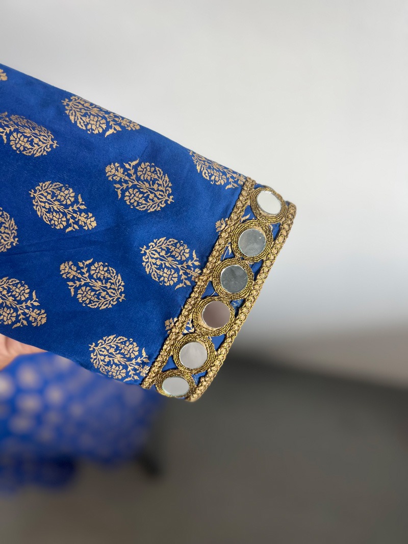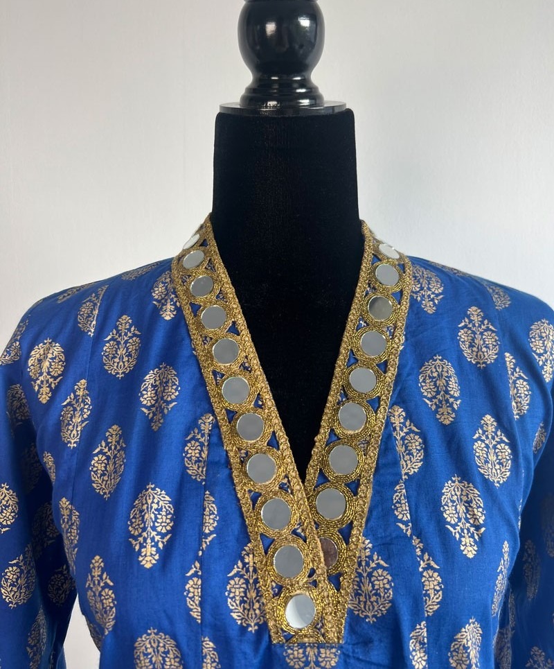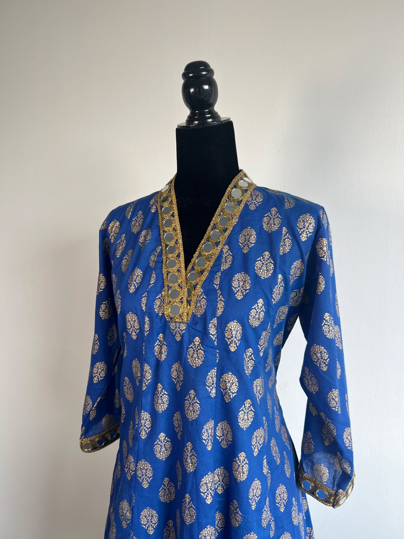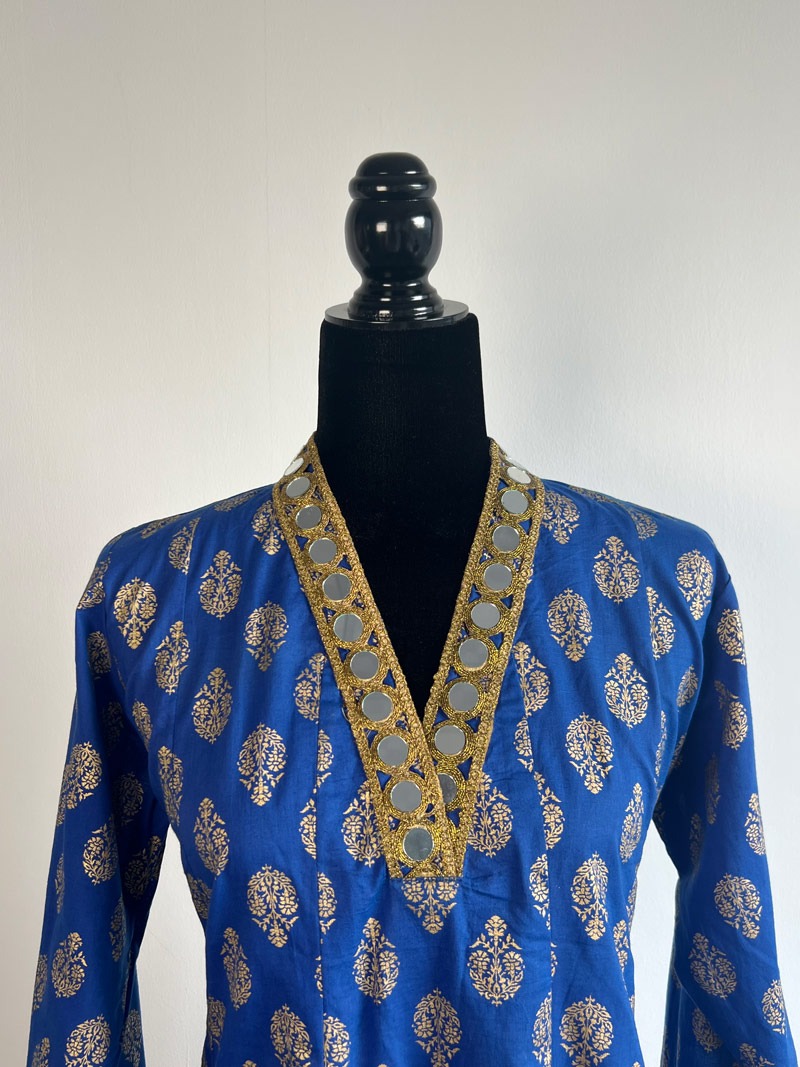 A regal royal blue long kurti with intricate gold motifs, designed with a statement mirror-embellished neckline and cuffs. Perfect for festive celebrations and special occasions.