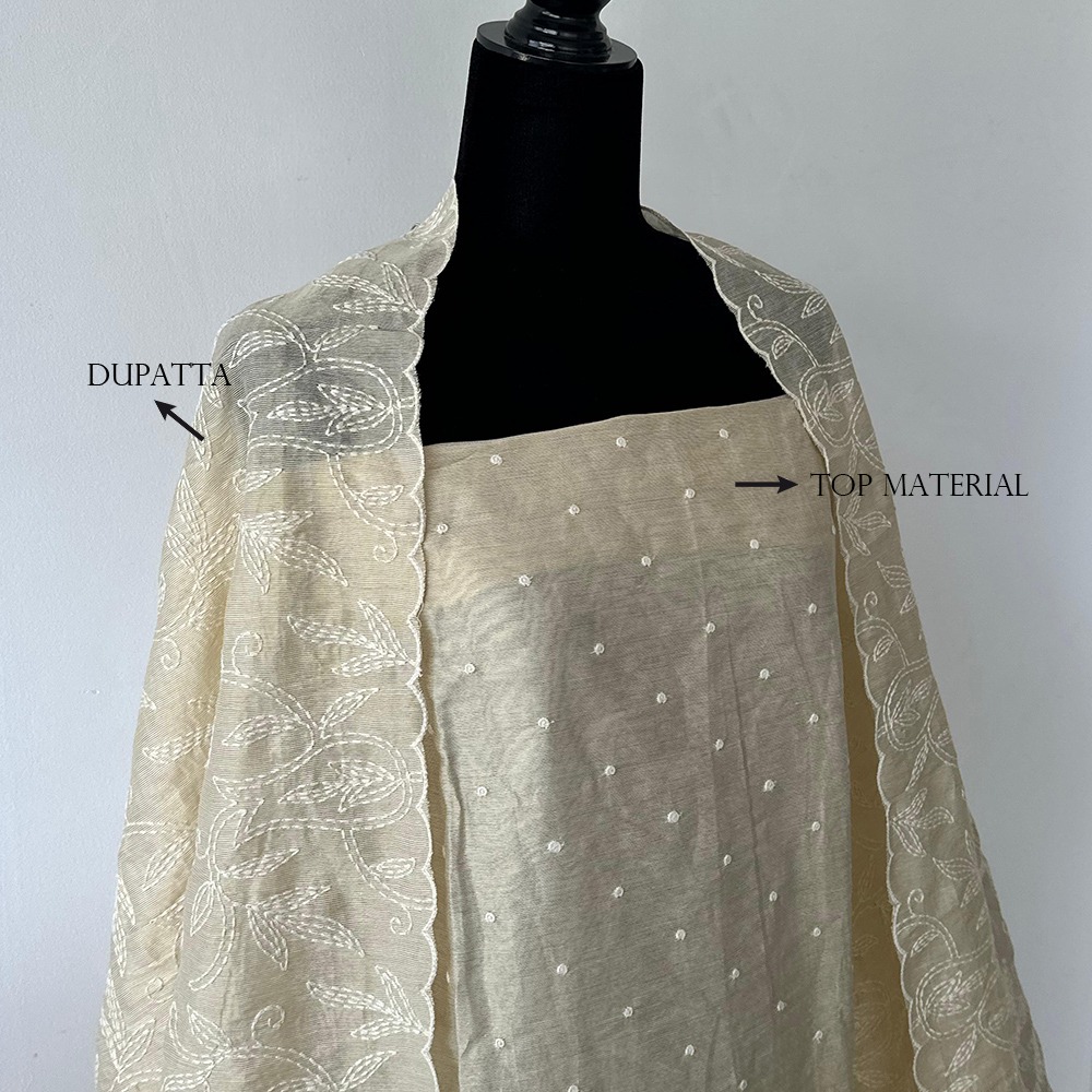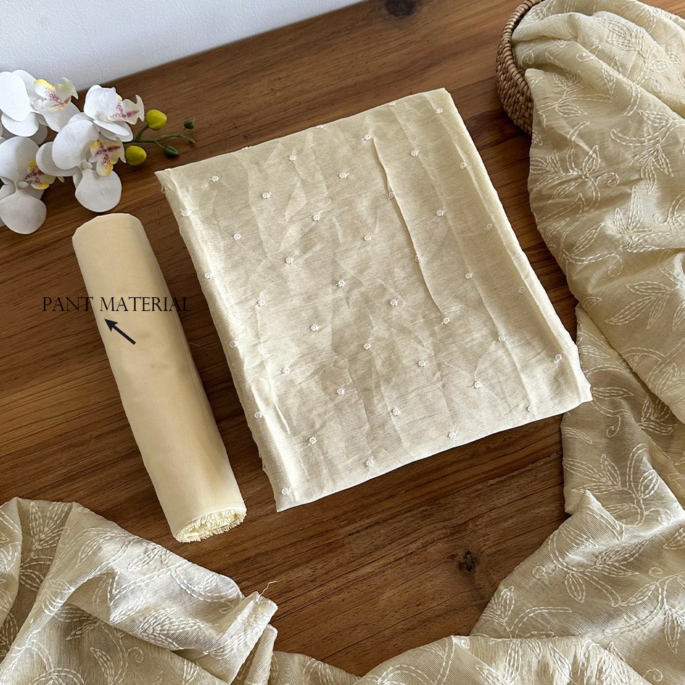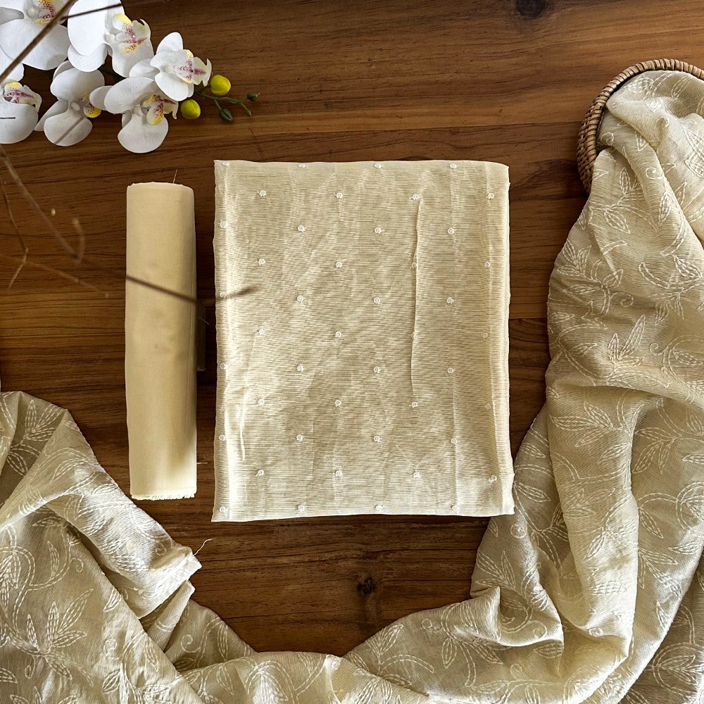 A soft cream-toned 3-piece unstitched set featuring a delicately embroidered top, plain matching pant material, and a floral-stitched dupatta. Subtle and versatile — perfect for everyday styling.