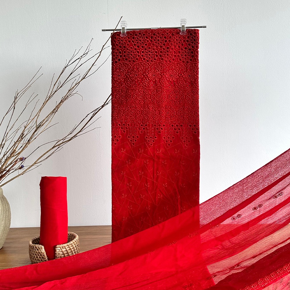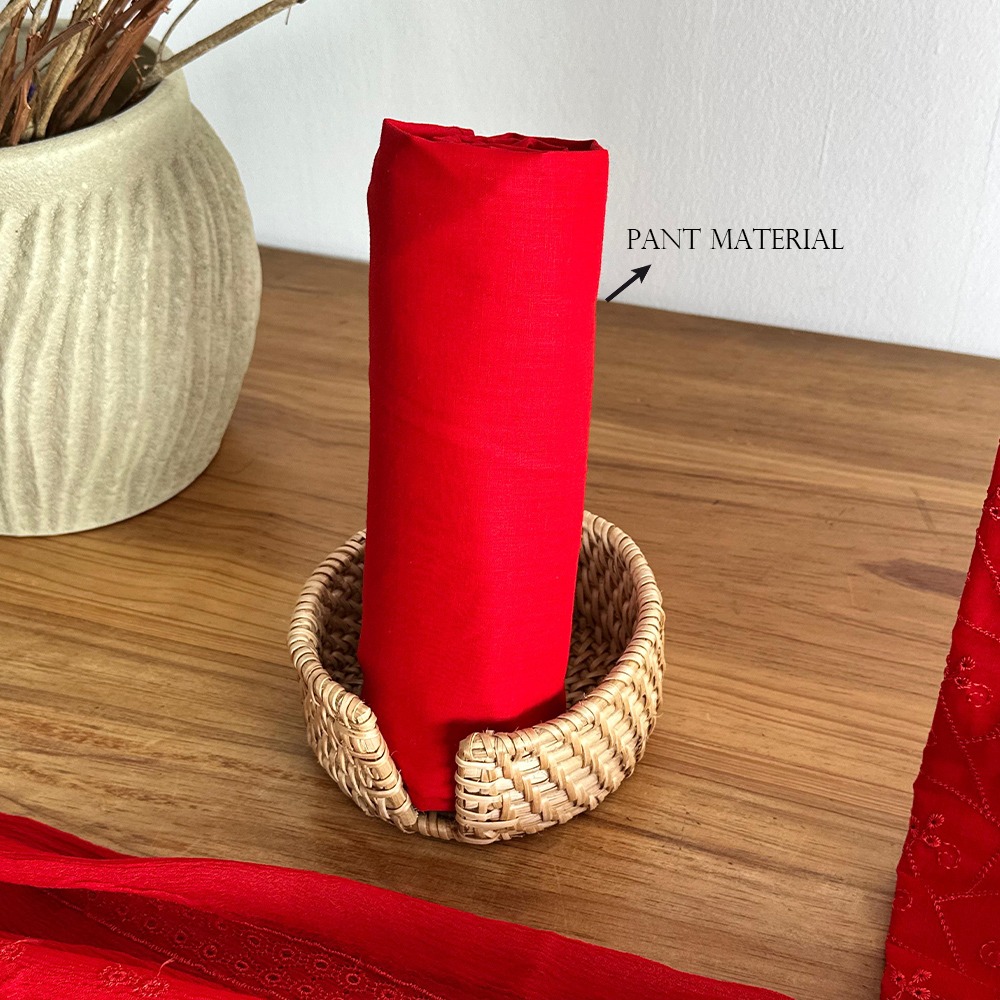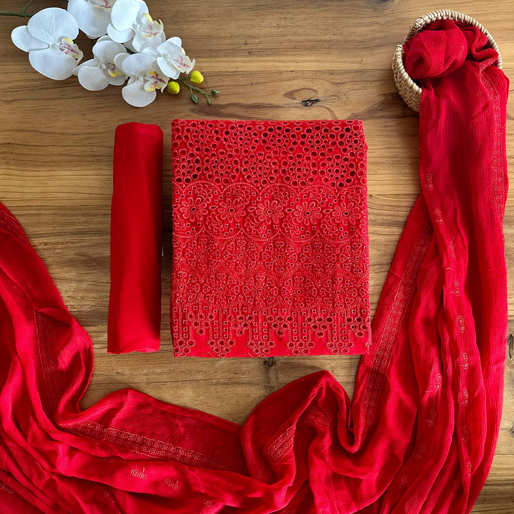 A bold red 3-piece unstitched set featuring a delicately embroidered chikankari top, plain pant material, and a soft dupatta with chikankari embroidery. Striking yet easy to wear — perfect for festive or everyday flair.