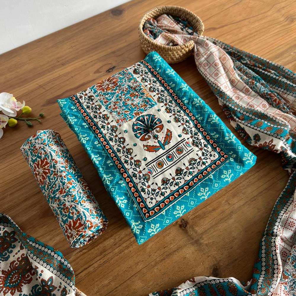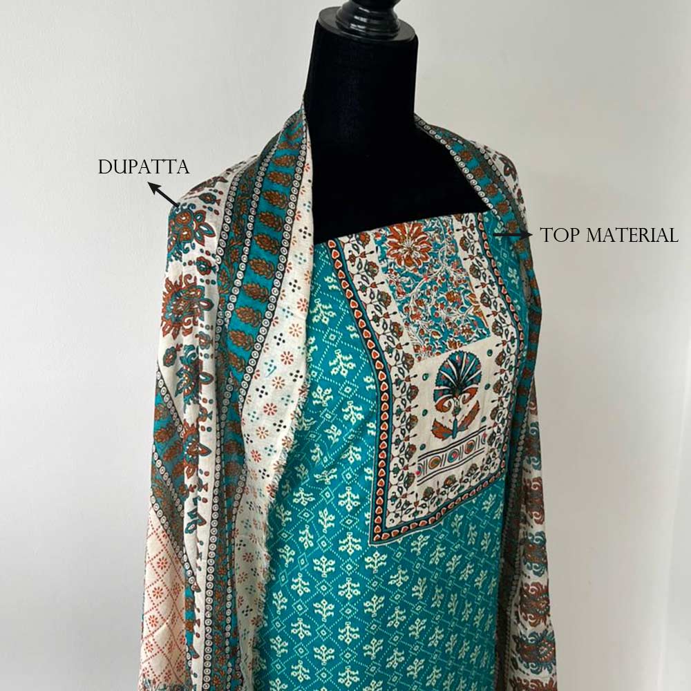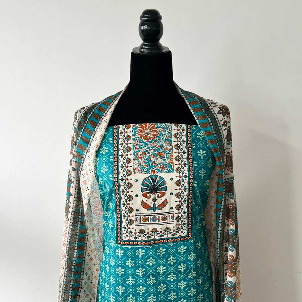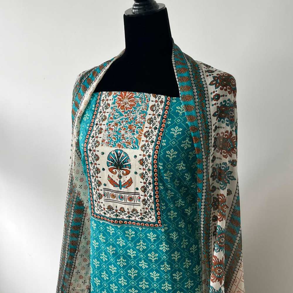 A sea blue block print unstitched 3-piece set with a printed top featuring detailed patterns. Comes with a soft printed dupatta and a matching pant piece to complete the set. A comfortable option for everyday wear, office days, or casual outings.