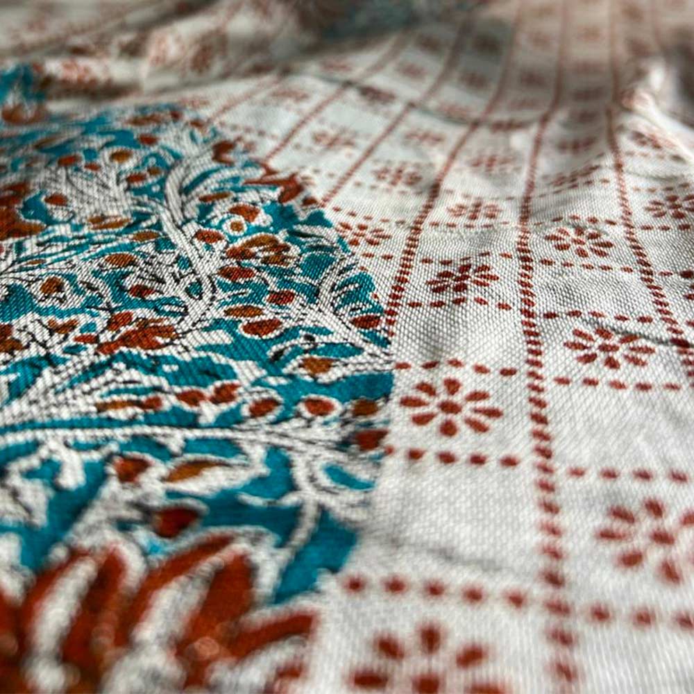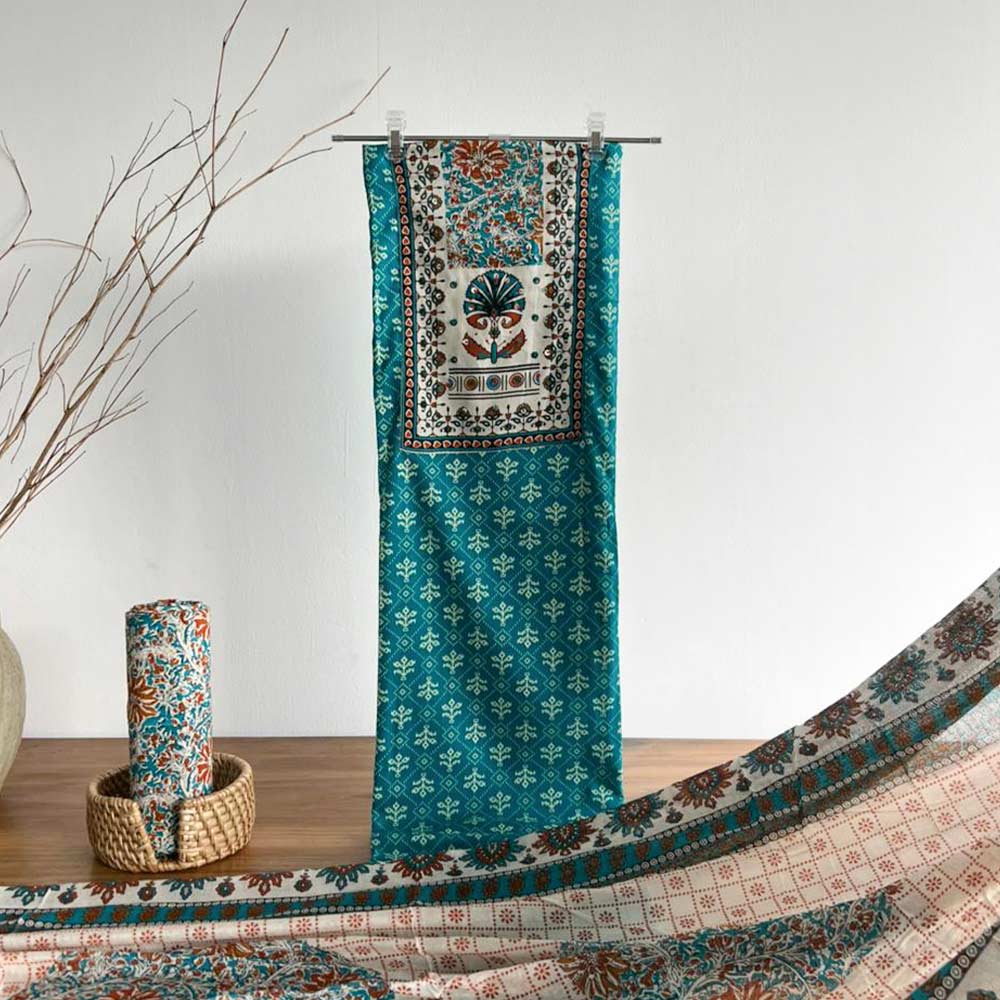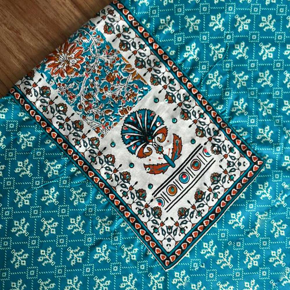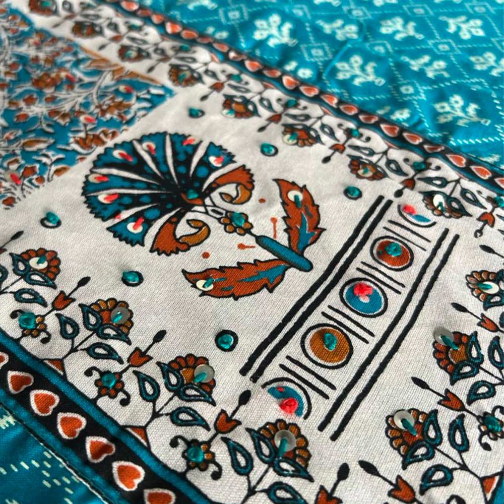A sea blue block print unstitched 3-piece set with a printed top featuring detailed patterns. Comes with a soft printed dupatta and a matching pant piece to complete the set. A comfortable option for everyday wear, office days, or casual outings.