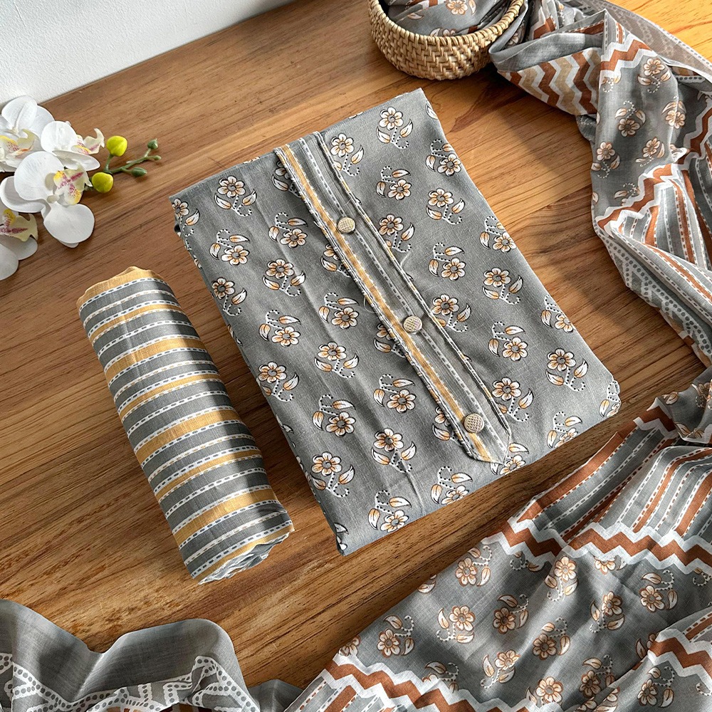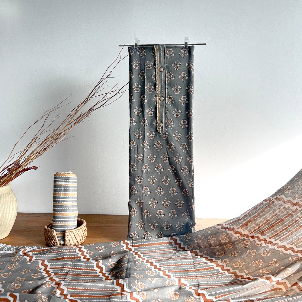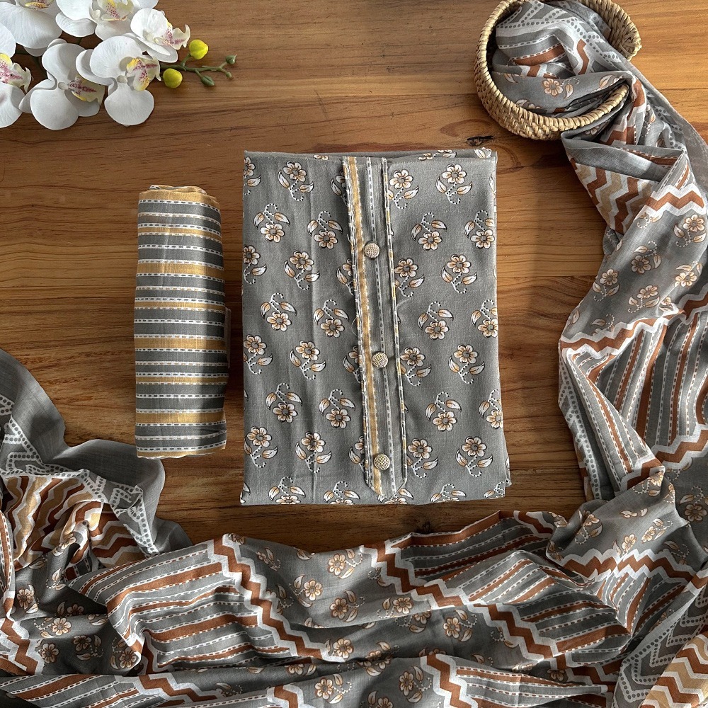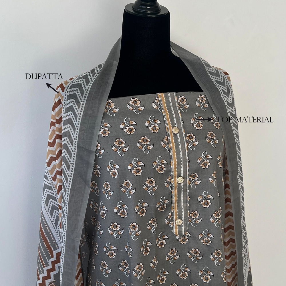 Grey unstitched salwar material displayed on a mannequin, featuring small floral prints with beige and brown detailing. Paired with a chevron-printed dupatta in grey, white, and rust brown tones.