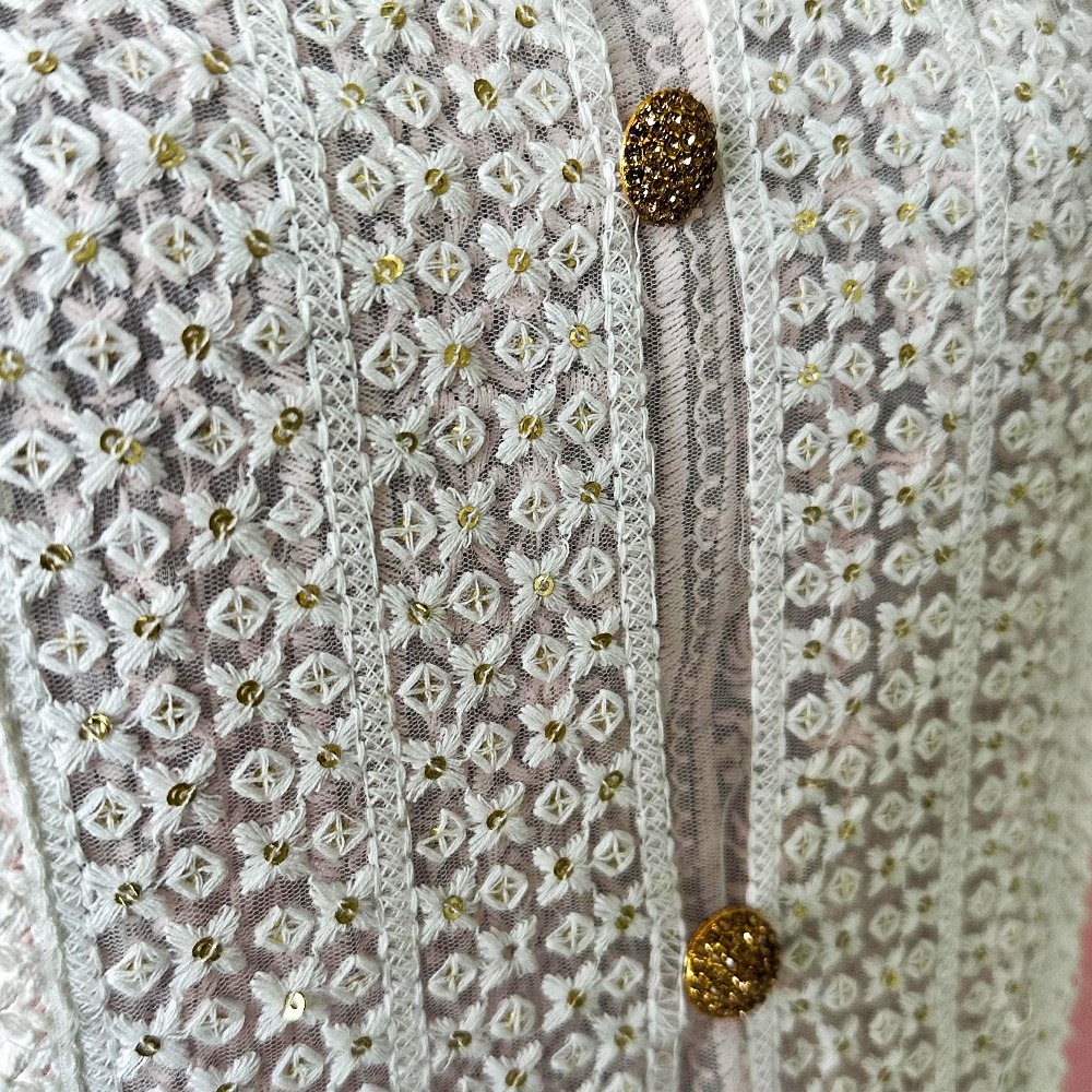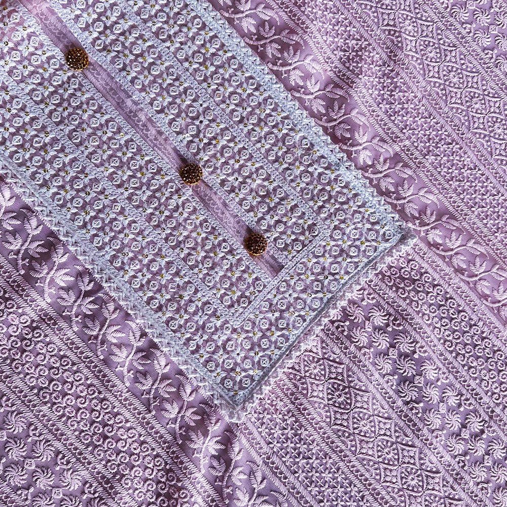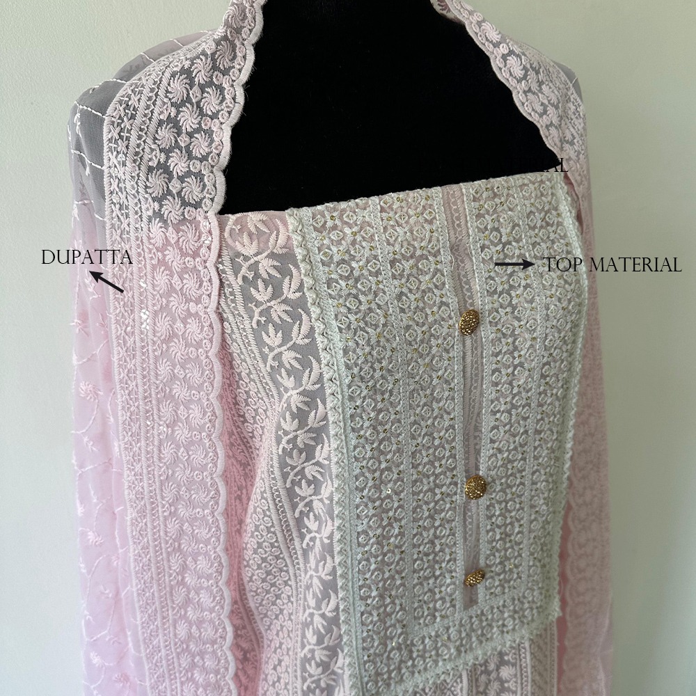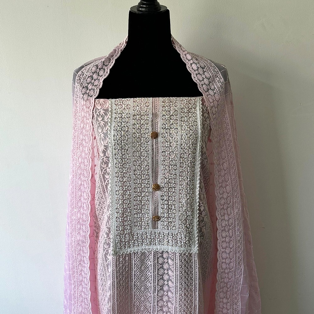 This soft hued pink set pairs a delicate pink top with fine chikankari embroirdered detailing, paired with a matching pant material and beautifully embroidered chikankari dupatta. It’s a look that blends tradition with softness — ready to style your way.