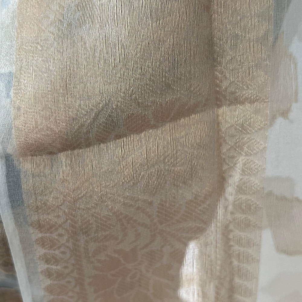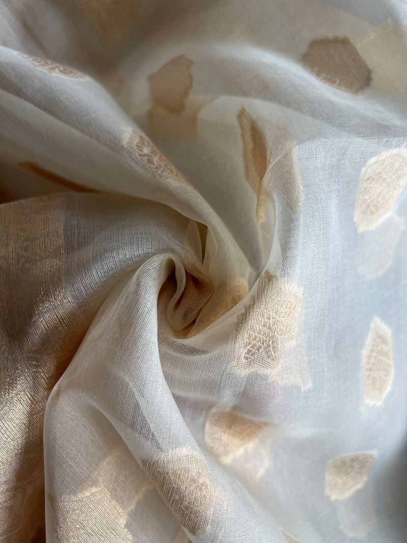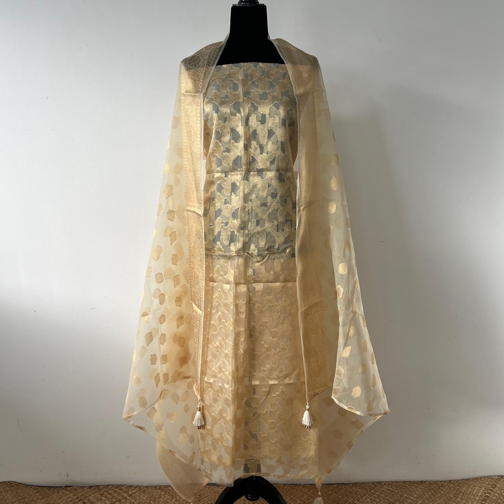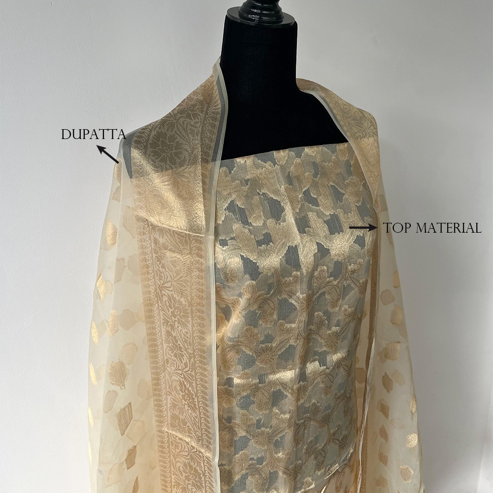 Unstitched Banarasi Pure Silk material in ivory and gold with intricate gold zari work. A great choice for festive and ethnic outfits.