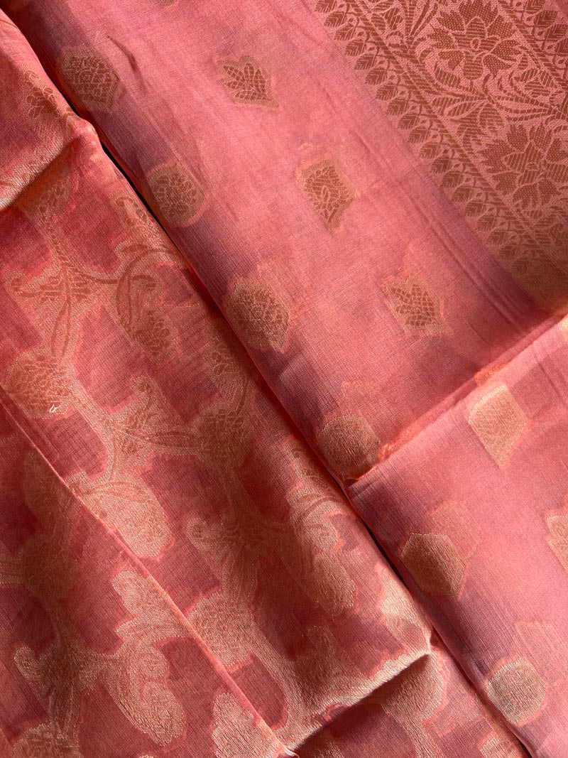 Unstitched Banarasi Pure Silk material in a beautiful peach and gold hue, adorned with intricate gold zari work. The rich fabric and delicate detailing make it perfect for stitching festive and traditional outfits.