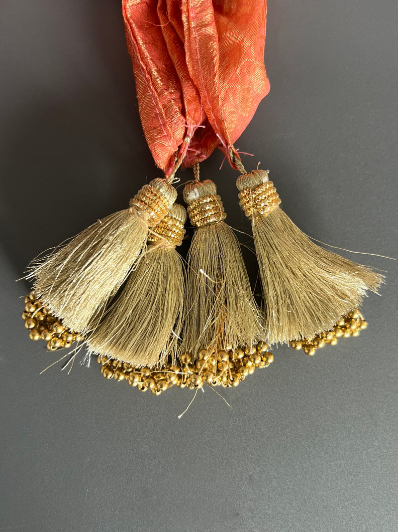 Red Banarasi-style dupatta with antique gold floral border and woven motifs, finished with red tassels, draped on a black mannequin.