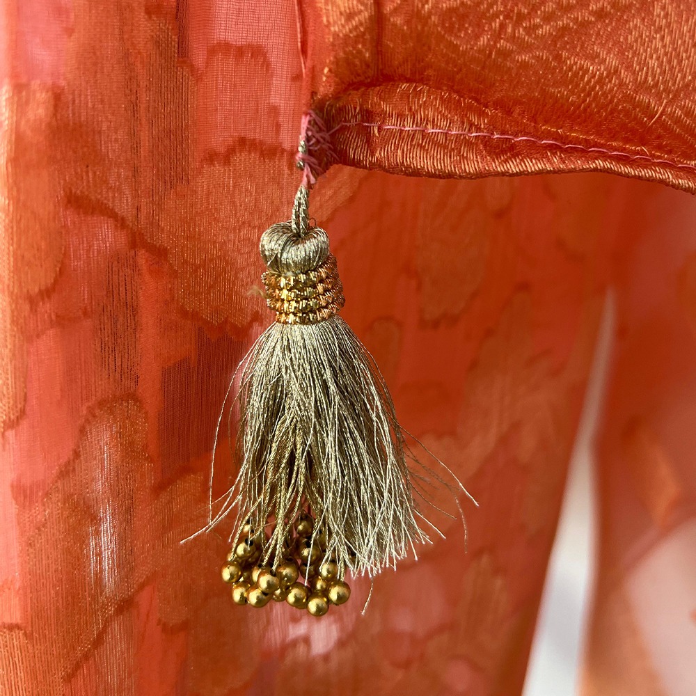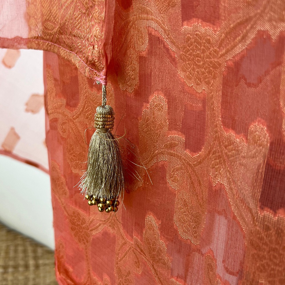 Be the first to review “Unstitched Banarasi Pure Silk Material – Peach & Gold” Cancel reply