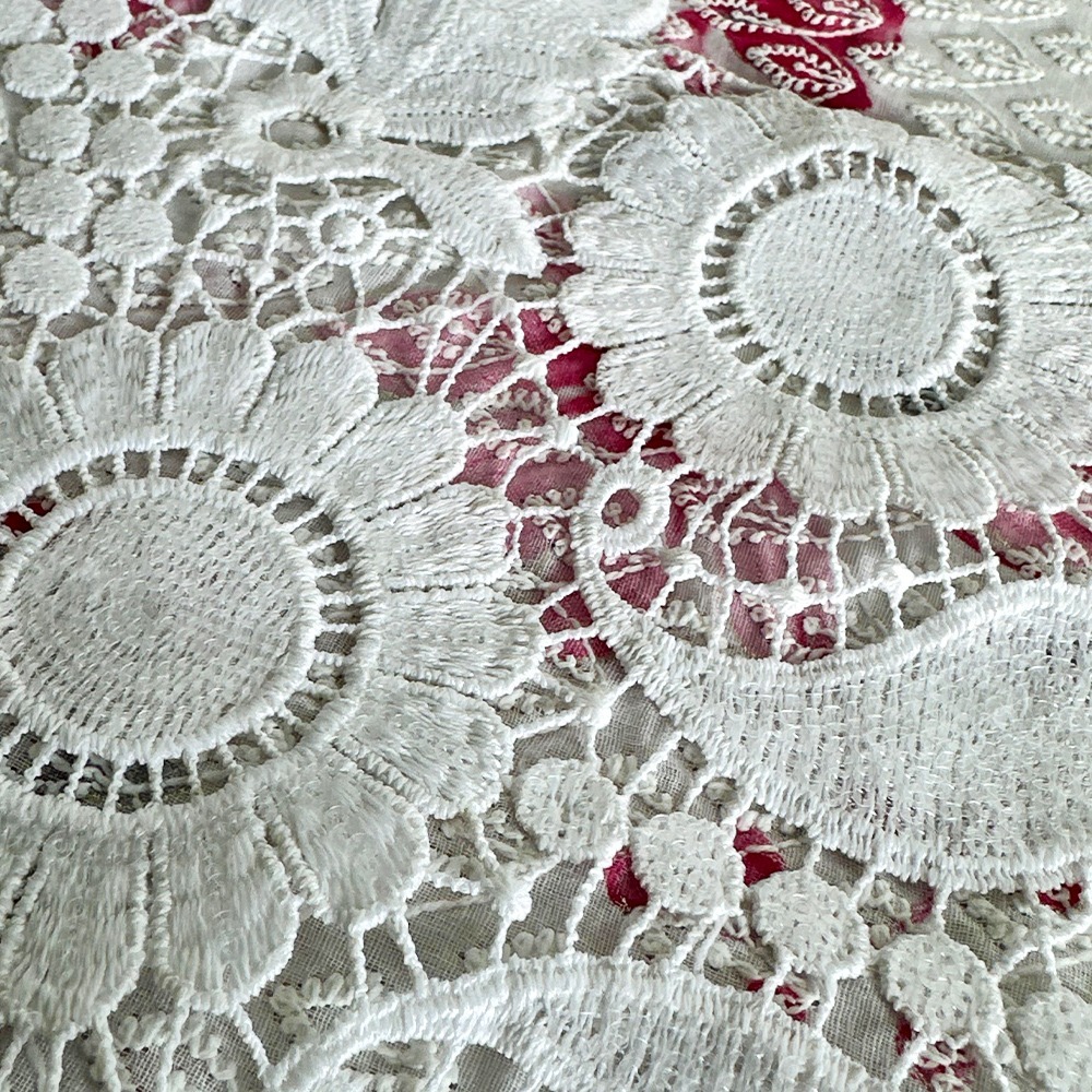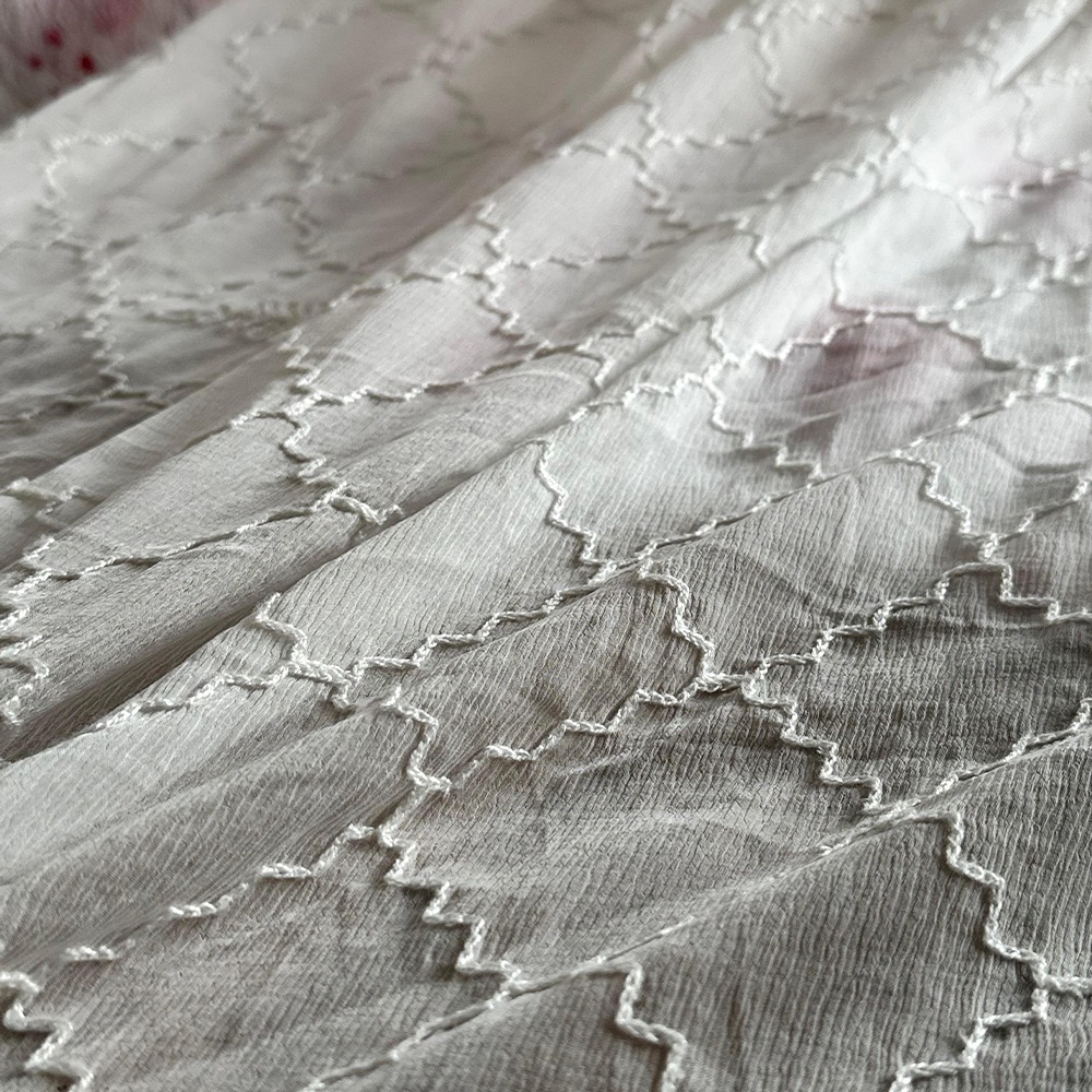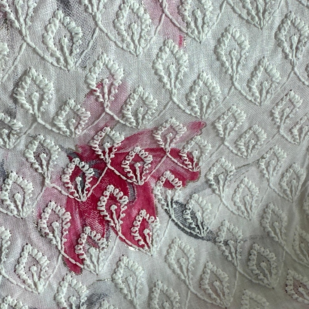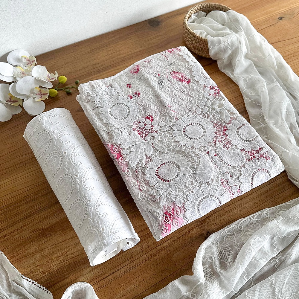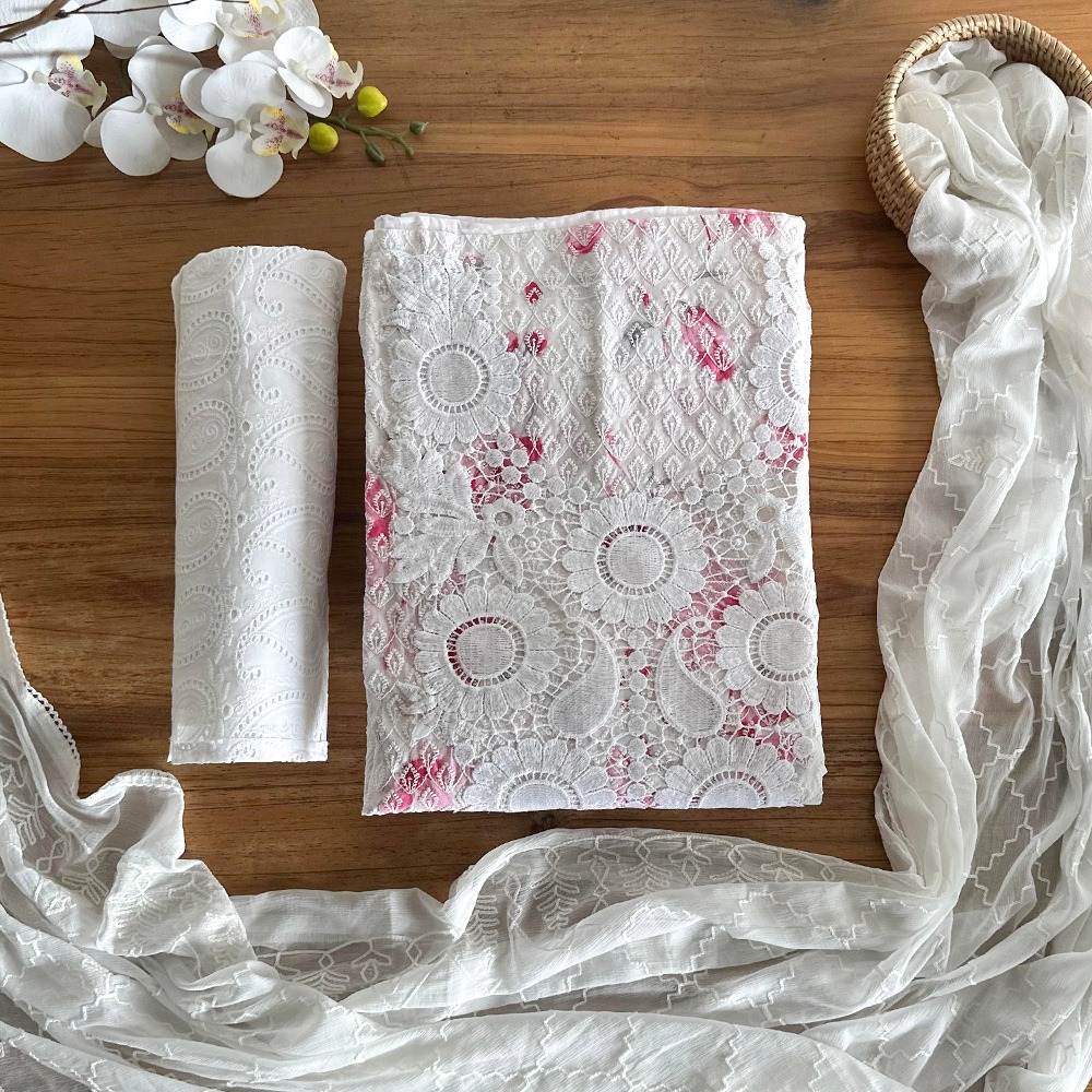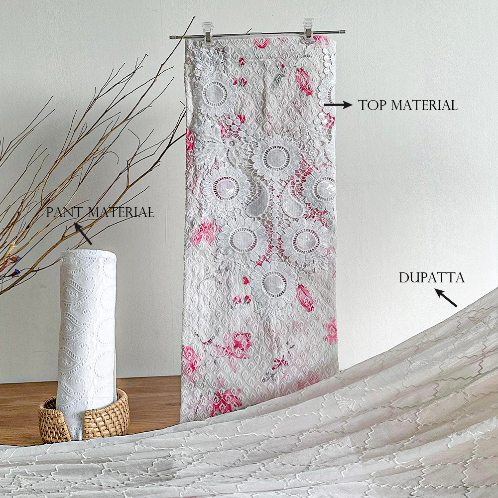 A white 3-piece unstitched set featuring a floral applique-embroidered top with subtle pink accents, plain matching pant fabric with delicate paisley weave, and a sheer dupatta with thread detailing. Soft, flowy, and styled for any occasion.