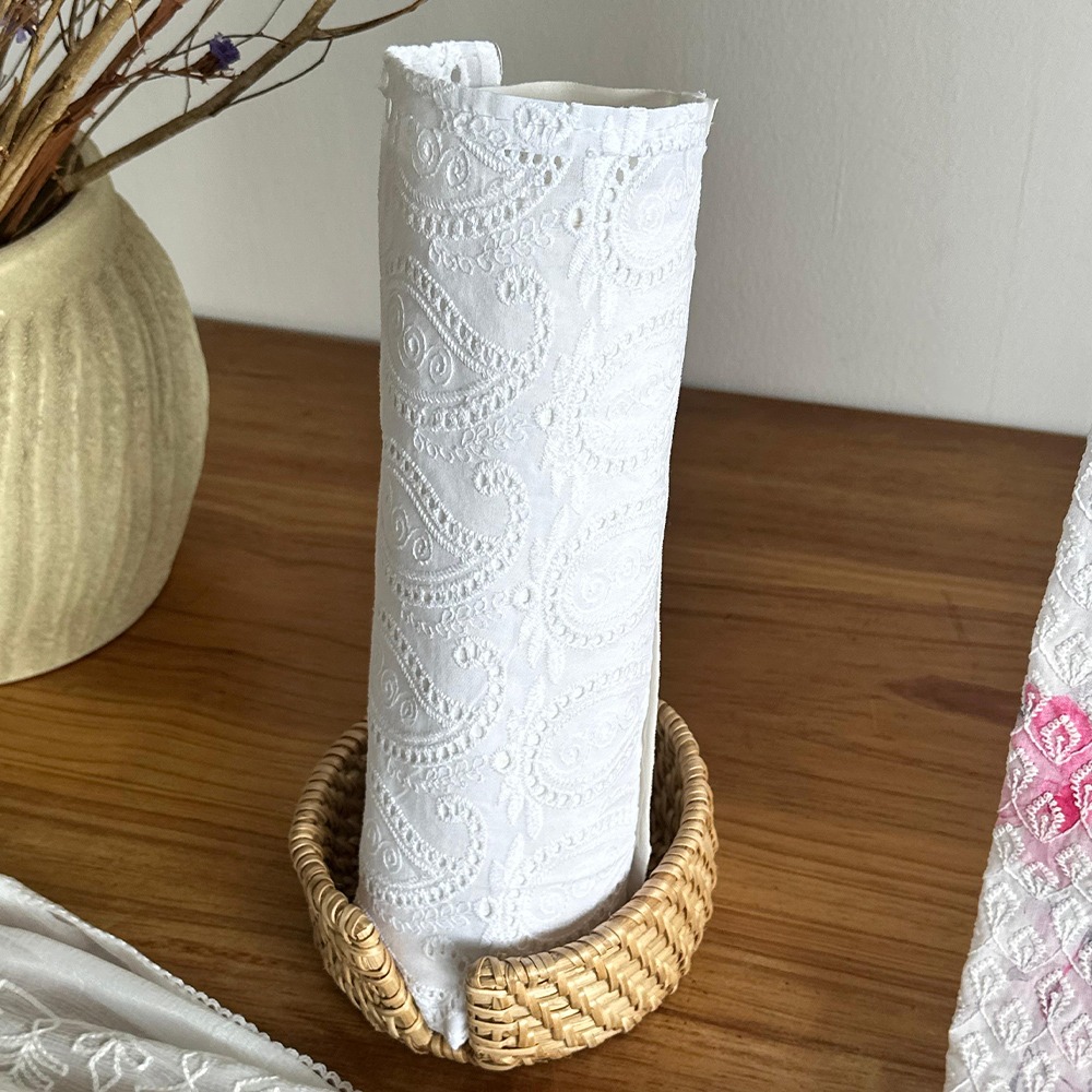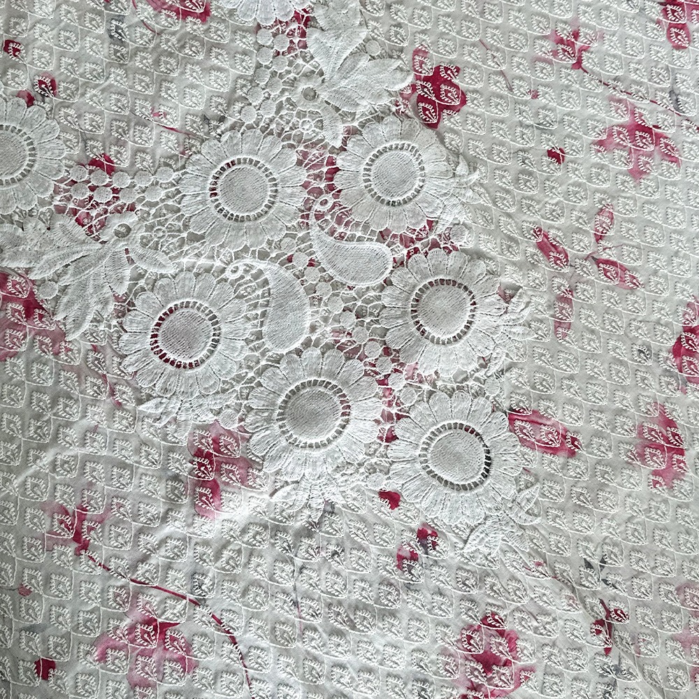 Angled flatlay of the white embroidered top with pink accents, paisley pant fabric, and sheer dupatta arranged on a wooden surface with orchid and basket decor.